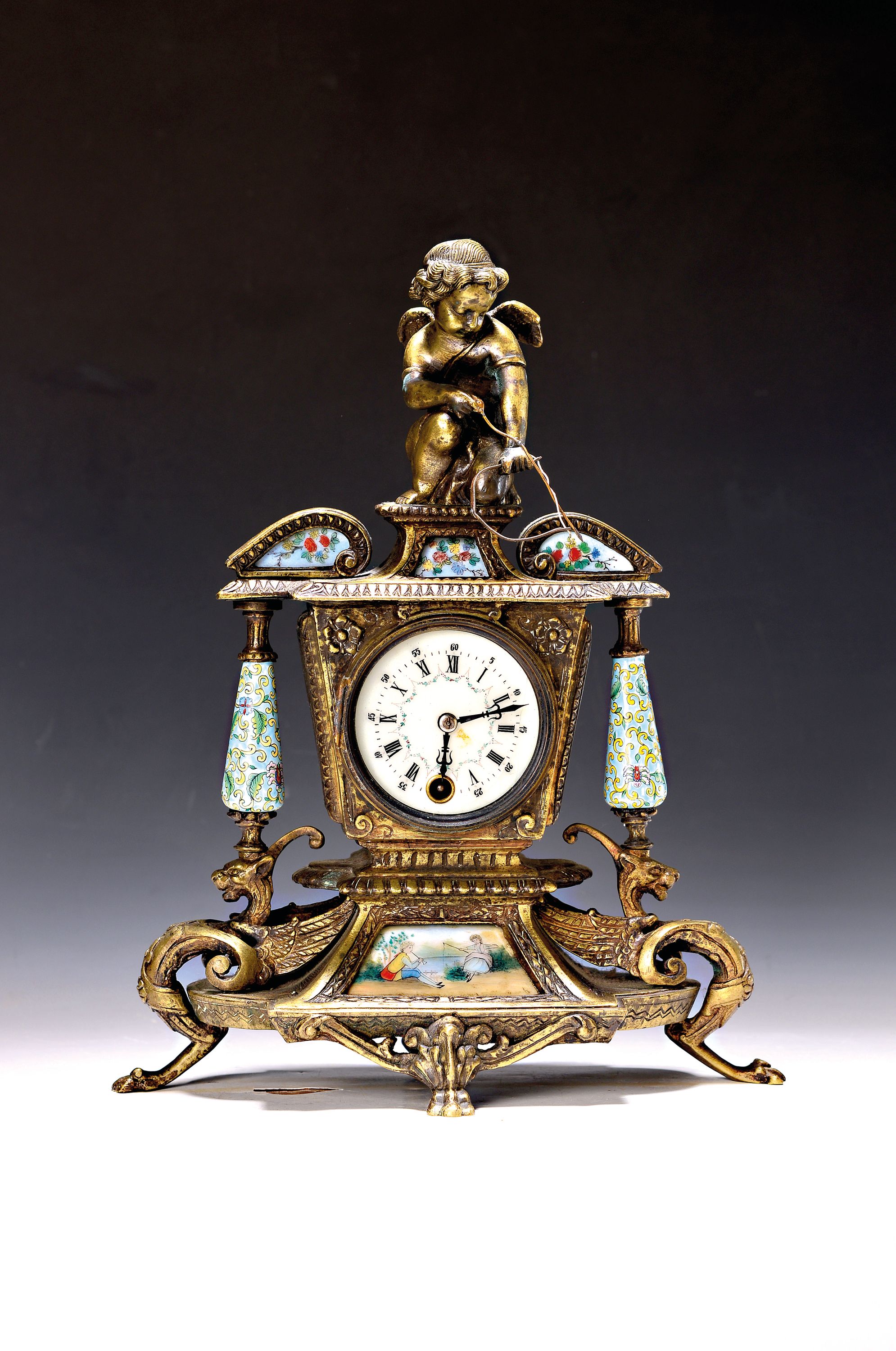 Amorbekrönung, Glasdeckel (Glas fehlt), Emailzifferblatt, Messingplatinenwerk mit