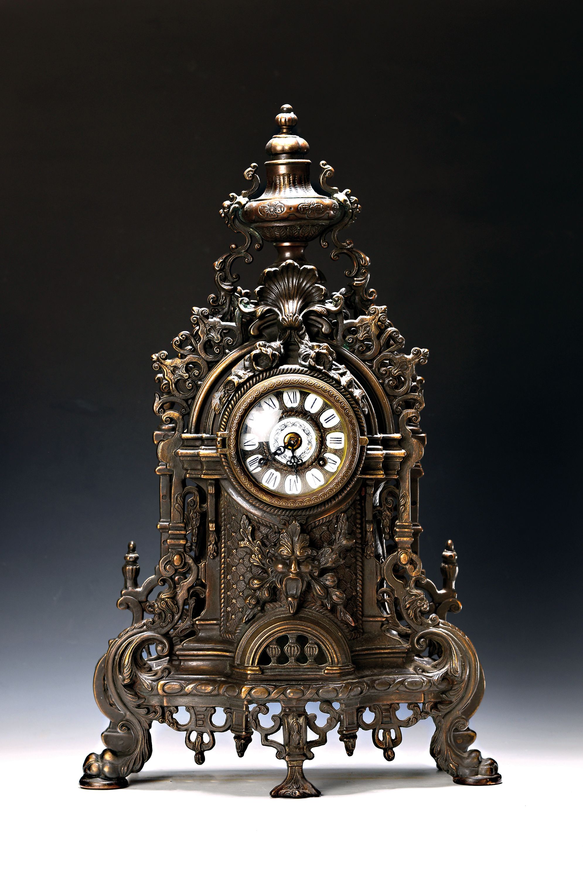 Große Tischuhr, Uhrenmanufaktur Hermle, um 1960/70, reich verzierter Messingguss