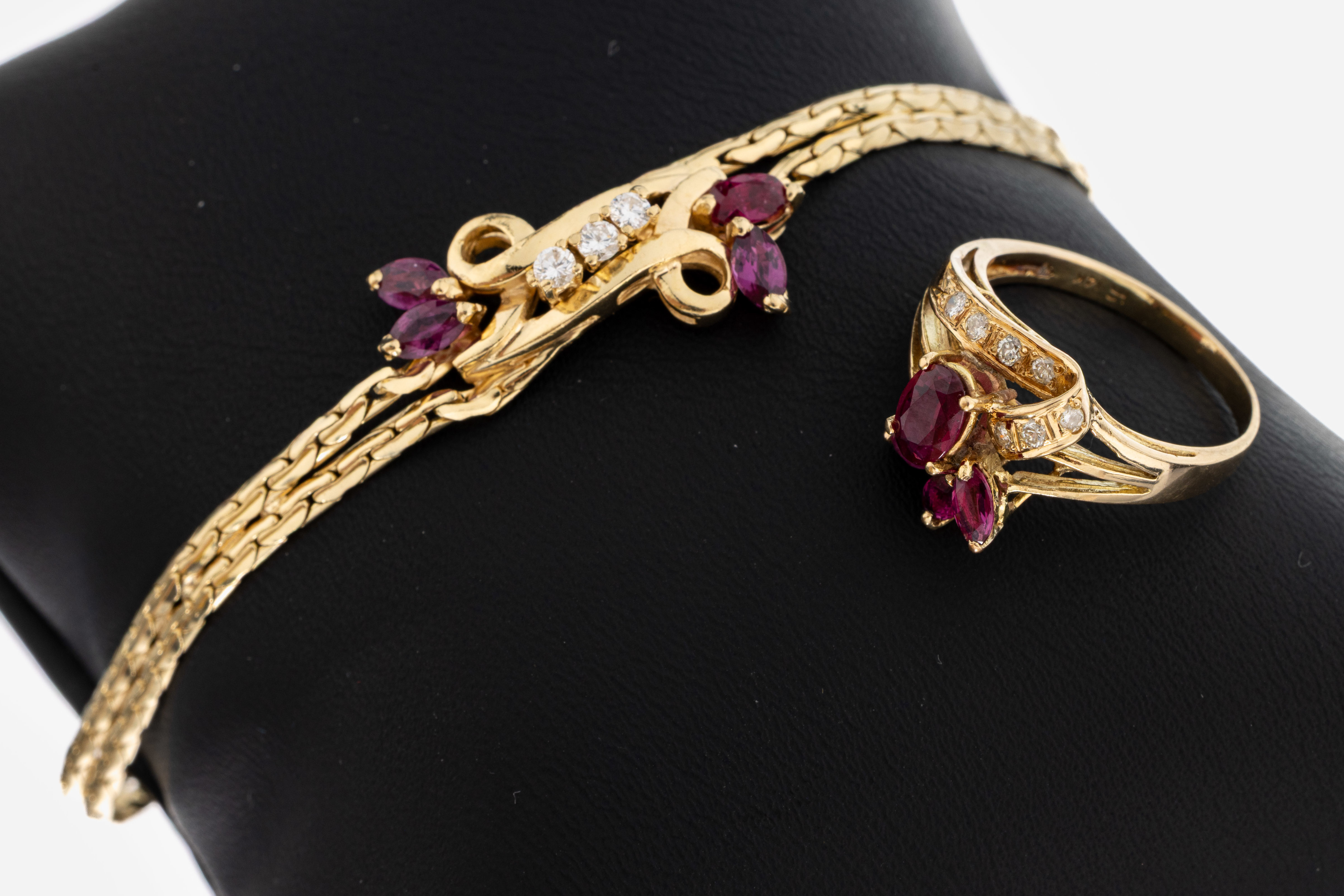 14 kt Gold Rubin Diamant Schmuckset, Armband und Ring, 7 Rubin-Navettes und 1 ovalfacett.