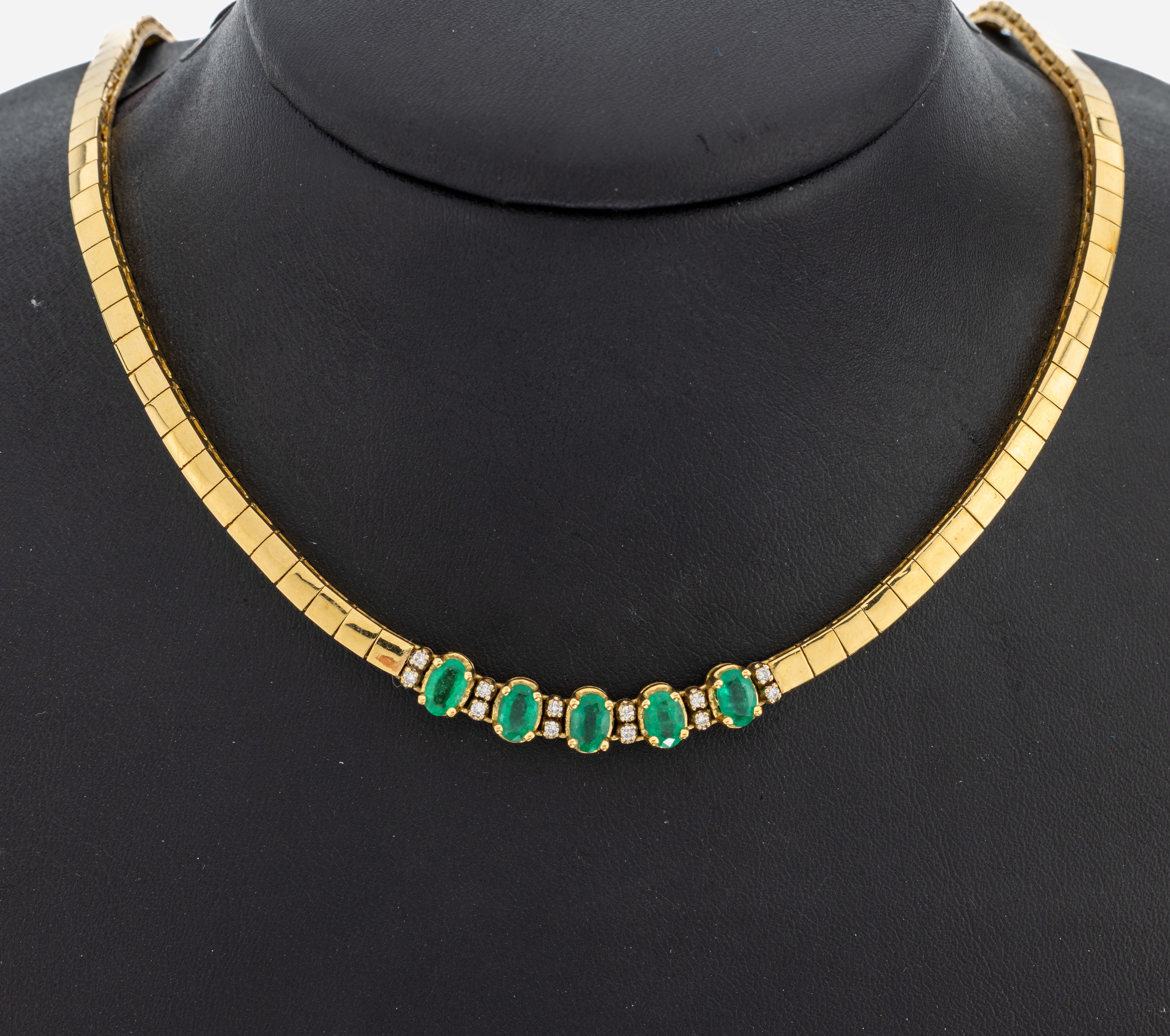 18 kt Gold Smaragd-Brillant-Collier, GG 750/000, 5 ovalfacett. Smaragde zus. ca.