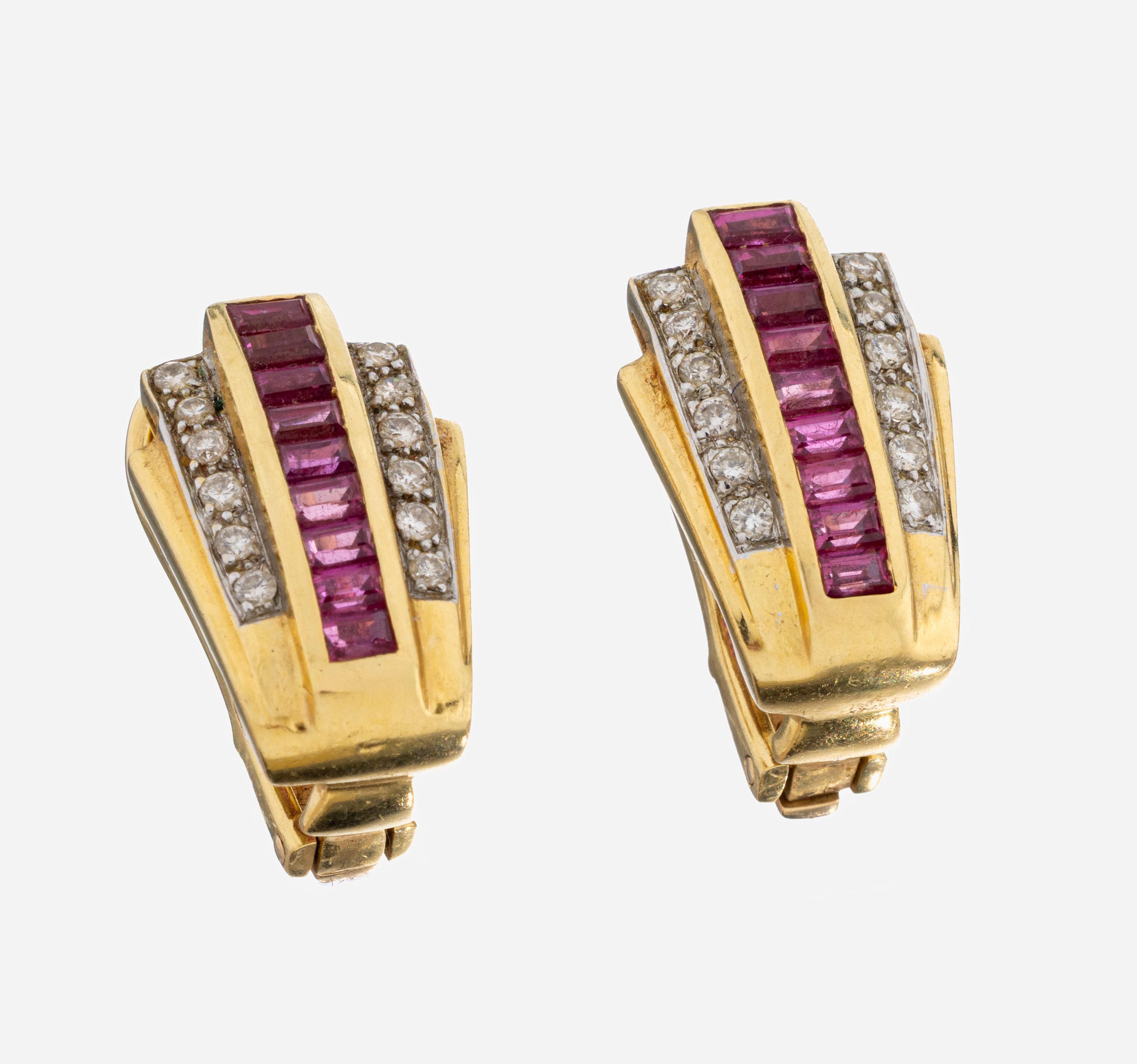 Paar 18 kt Gold Rubin-Brillant-Ohrclips, GG750/000, Rubin-Baguettes zus. ca. 1.0