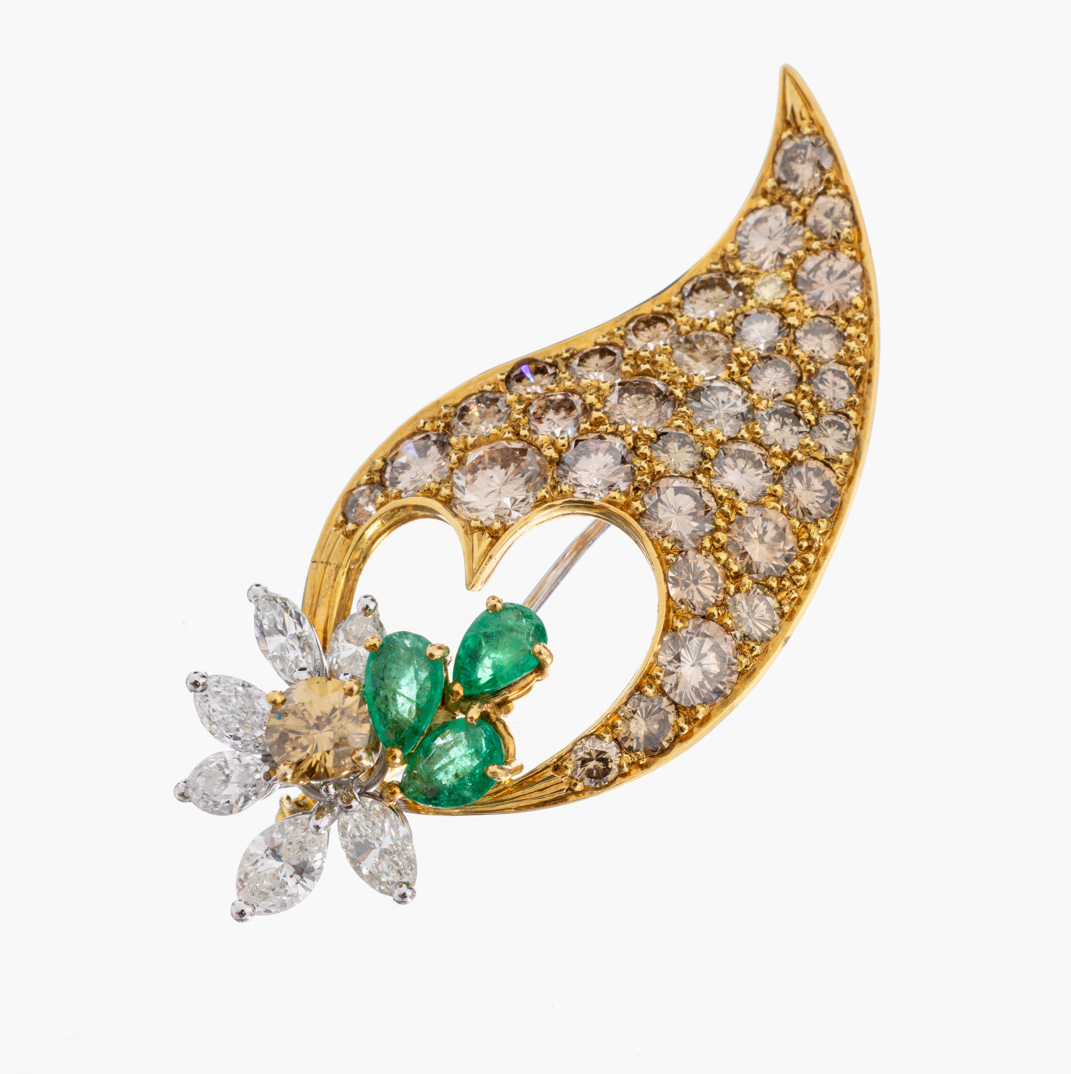 18 kt Gold Diamant-Smaragd-Brosche, GG/WG 750/000, abstrakte Gestaltung, 36 Brillanten