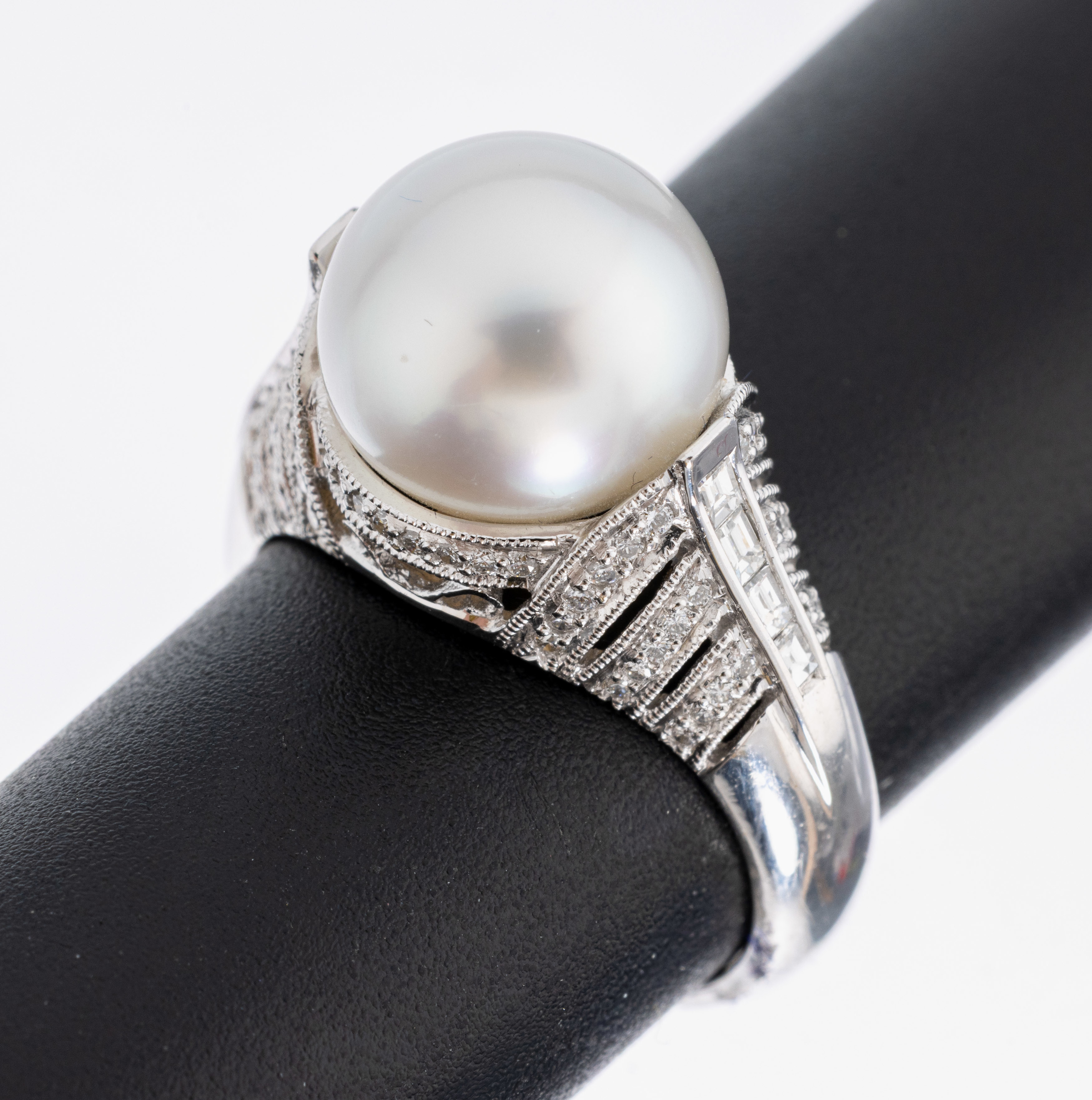 18 kt Gold Perl-Diamant-Ring, WG 750/000, weiße Südseezuchtperle, D. ca. 11.1 mm,
