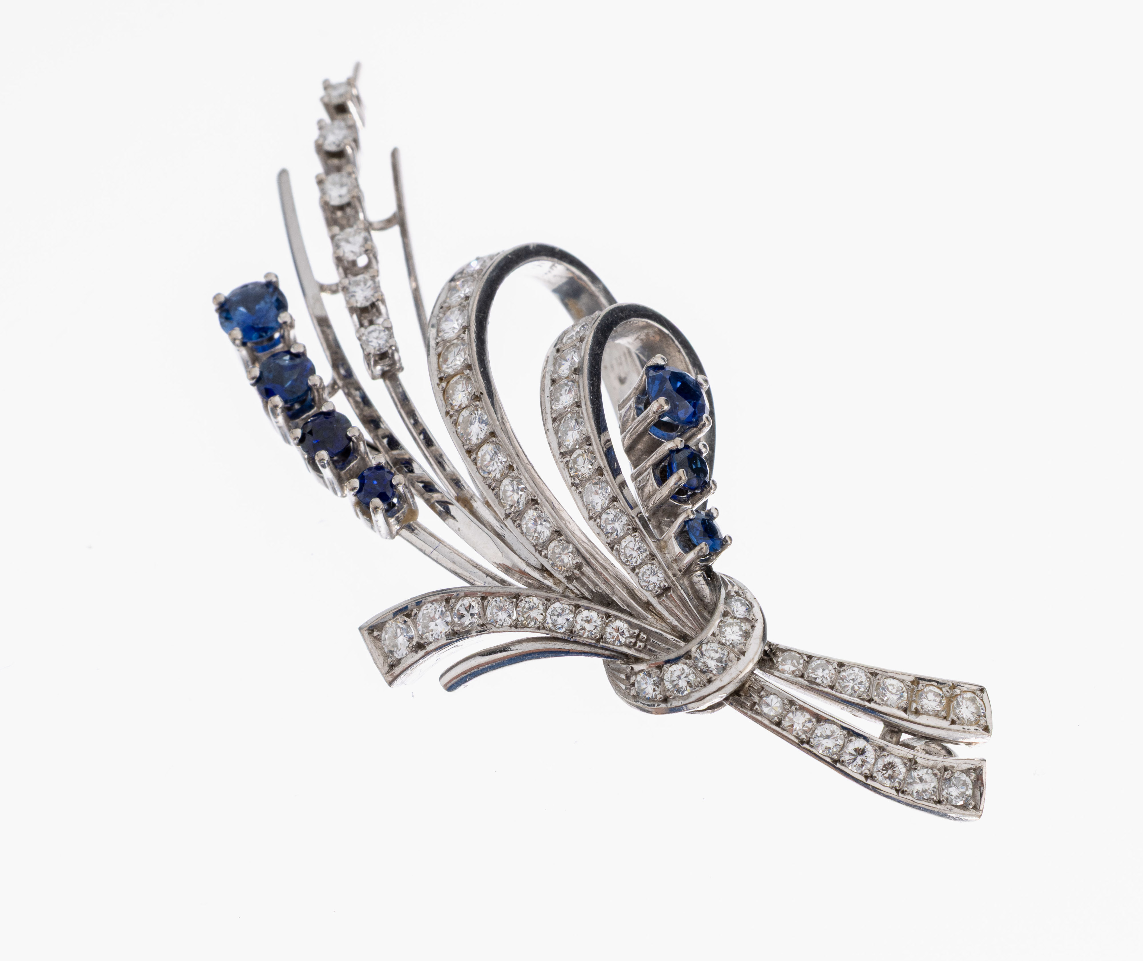 14 kt Gold Saphir-Brillant-Brosche, WG 585/000, 7 rundfacett. Saphire zus. ca. 0.20