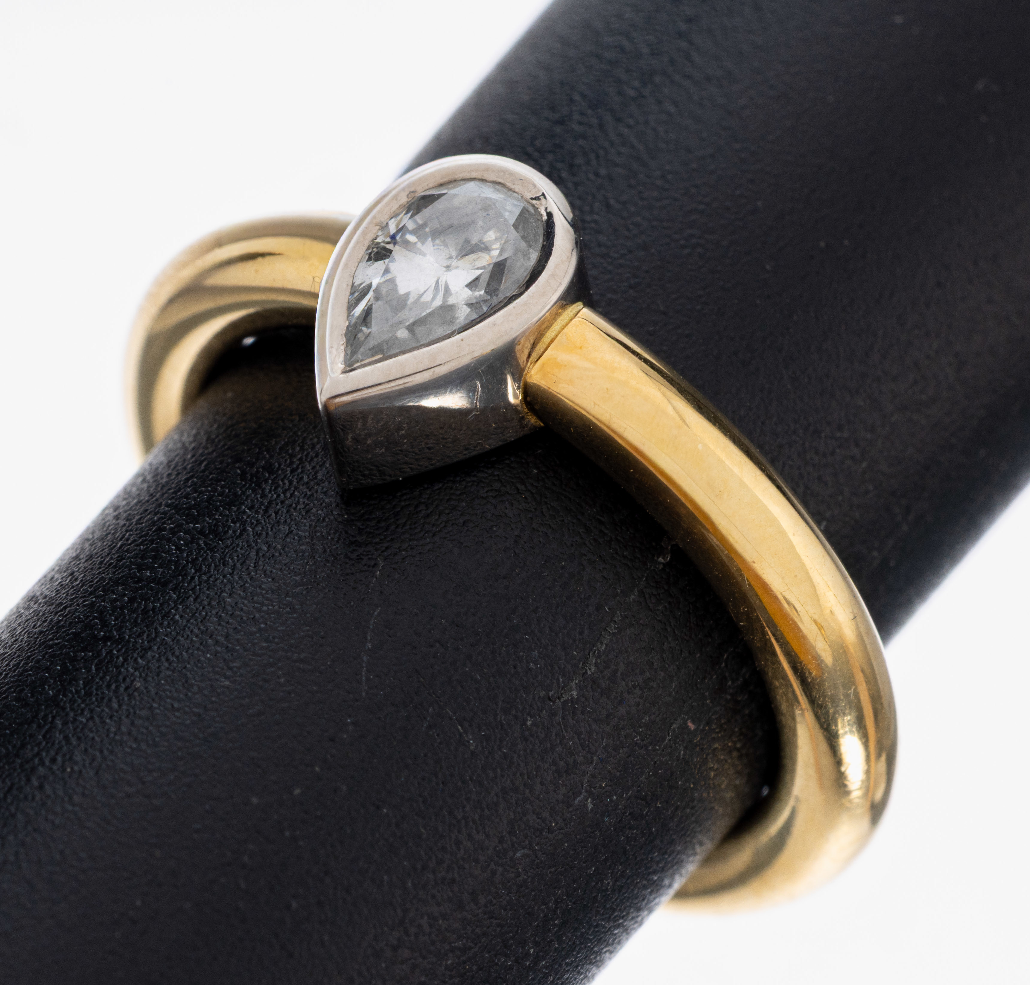 18 kt Gold Diamant-Ring, GG 750/000, Diamant-Tropfen ca. 0.69 ct Weiß/p2-3, RW 56,