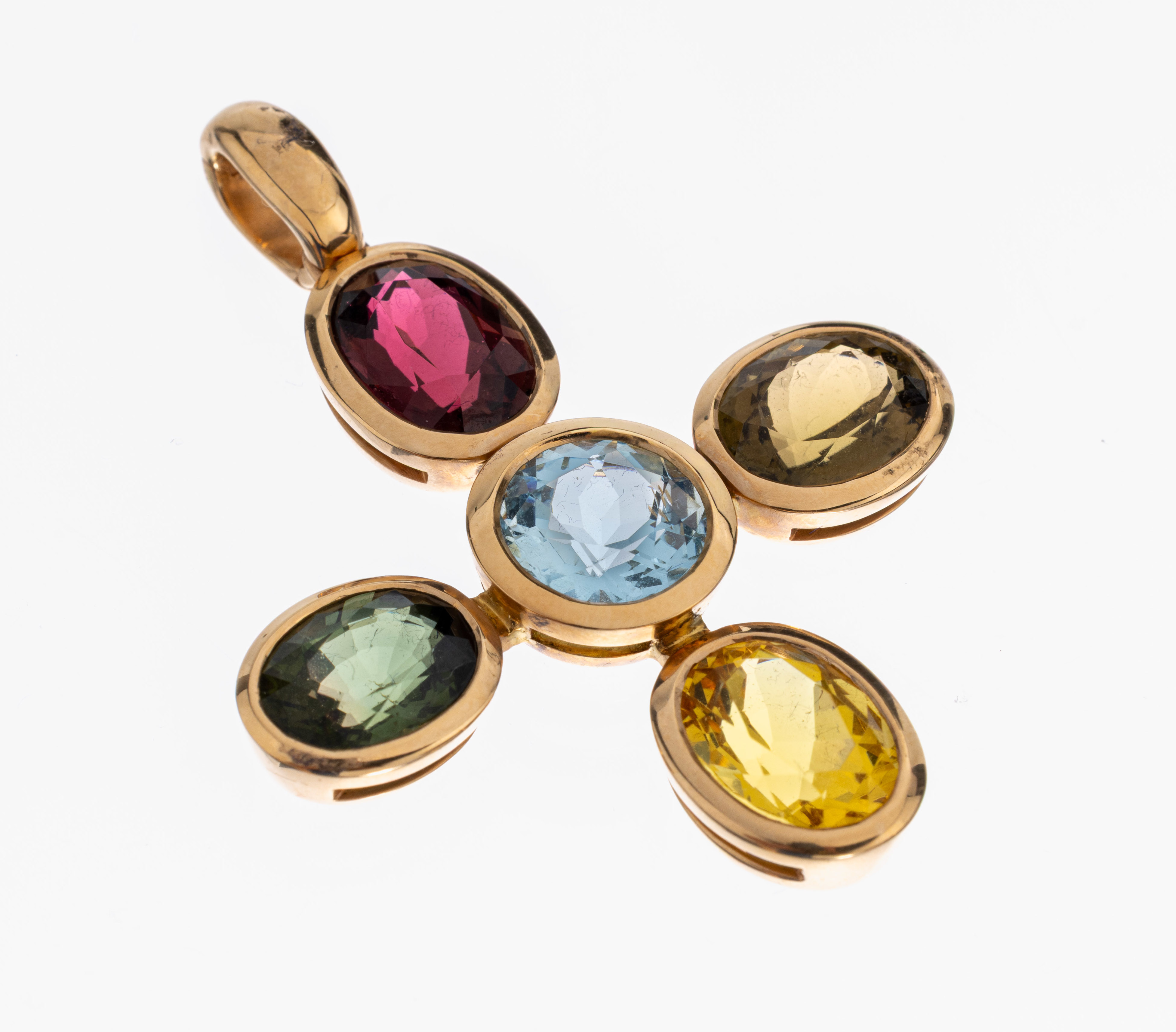 18 kt Gold Farbstein-Kreuzanhänger, GG 750/000 gepr., mittig rundfacett. Aquamarin