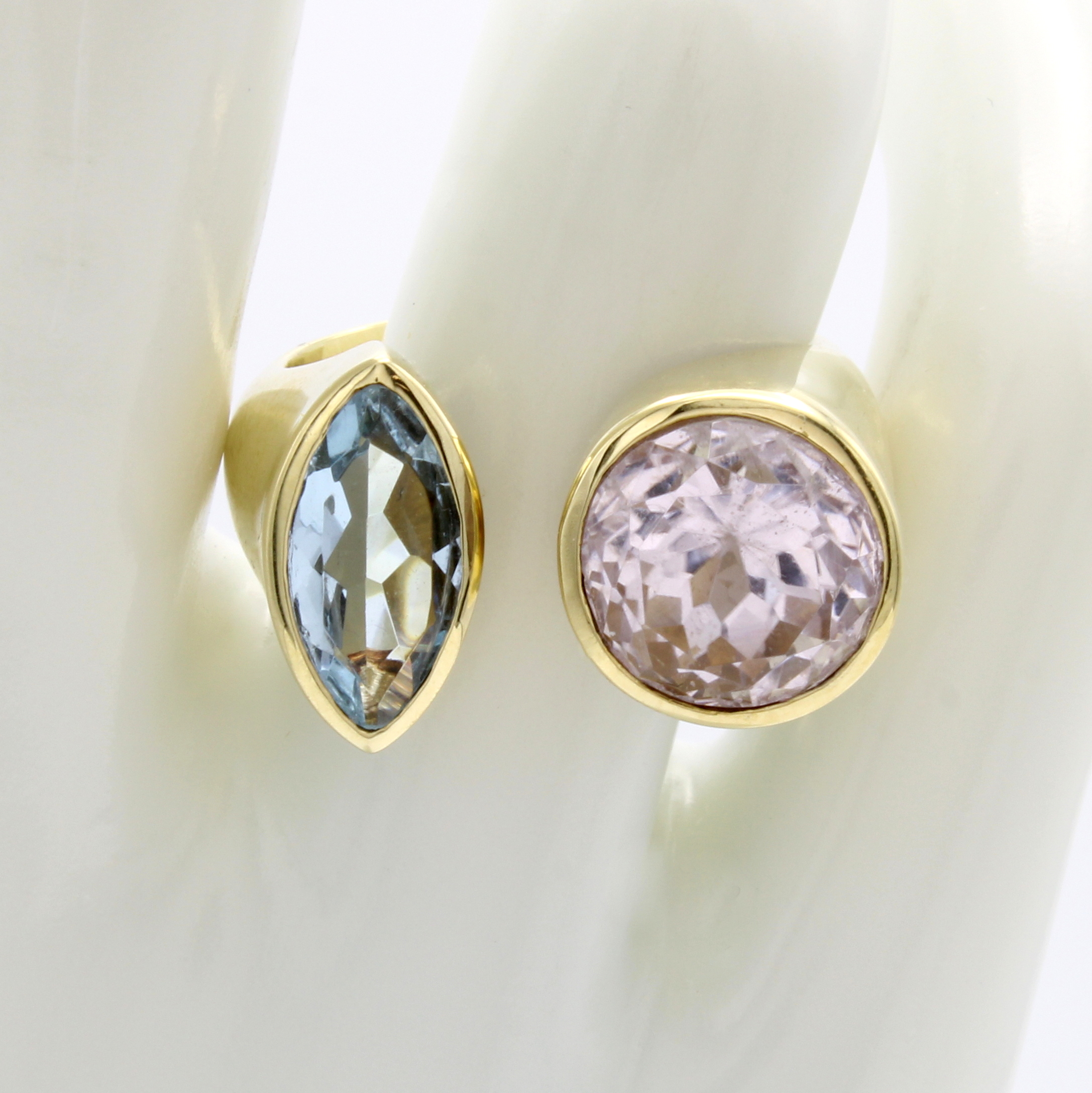 Ring mit Farbsteinen, GG 585/000, offen gearb., Aquamarinnavette ca. 1 ct, runder, fac. Kunzit ca. 6 ct, RW ca. 57 Schätzpreis: 4980, - EUR