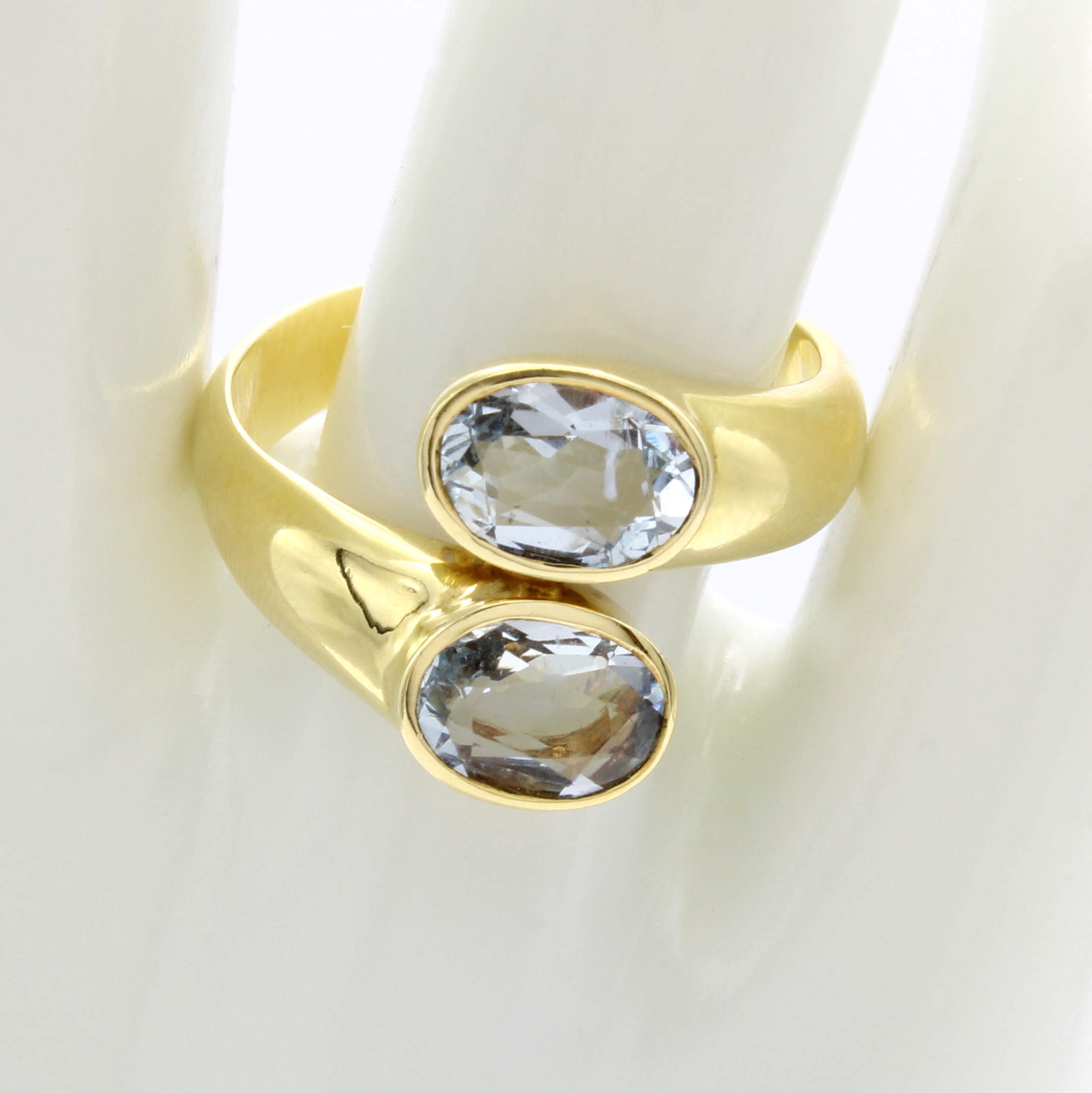 Ring mit Aquamarinen, GG 585/000, gegenläufige Ringschiene, 2 ovale, fac. Aquamarine zus. ca. 2 ct, RW ca. 60 Schätzpreis: 2300, - EUR