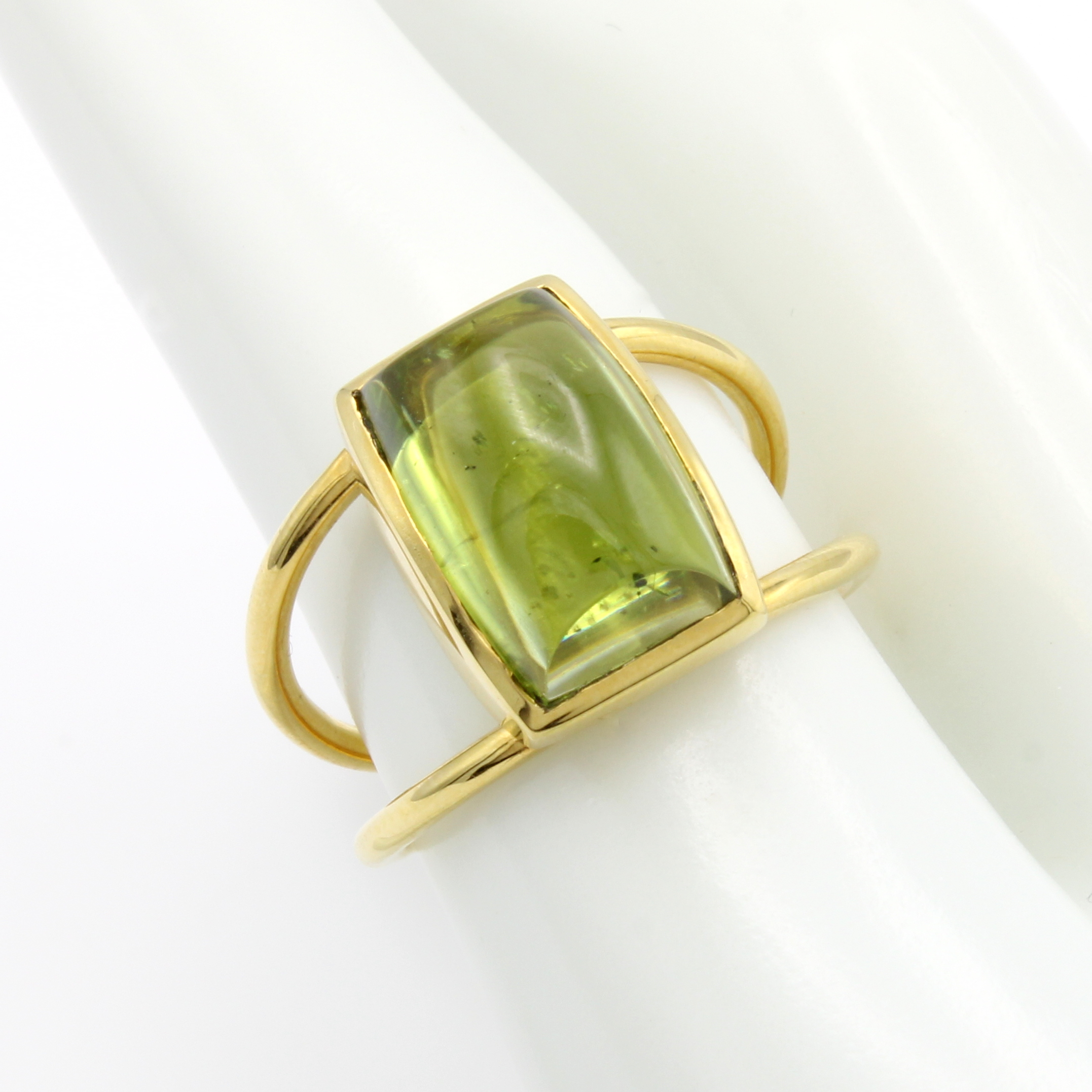 Ring mit Peridot, GG 585/000, geteilte Ringschiene, eckiger Peridotcabochon ca. 6.8 ct, RW ca. 56 Schätzpreis: 2200, - EUR