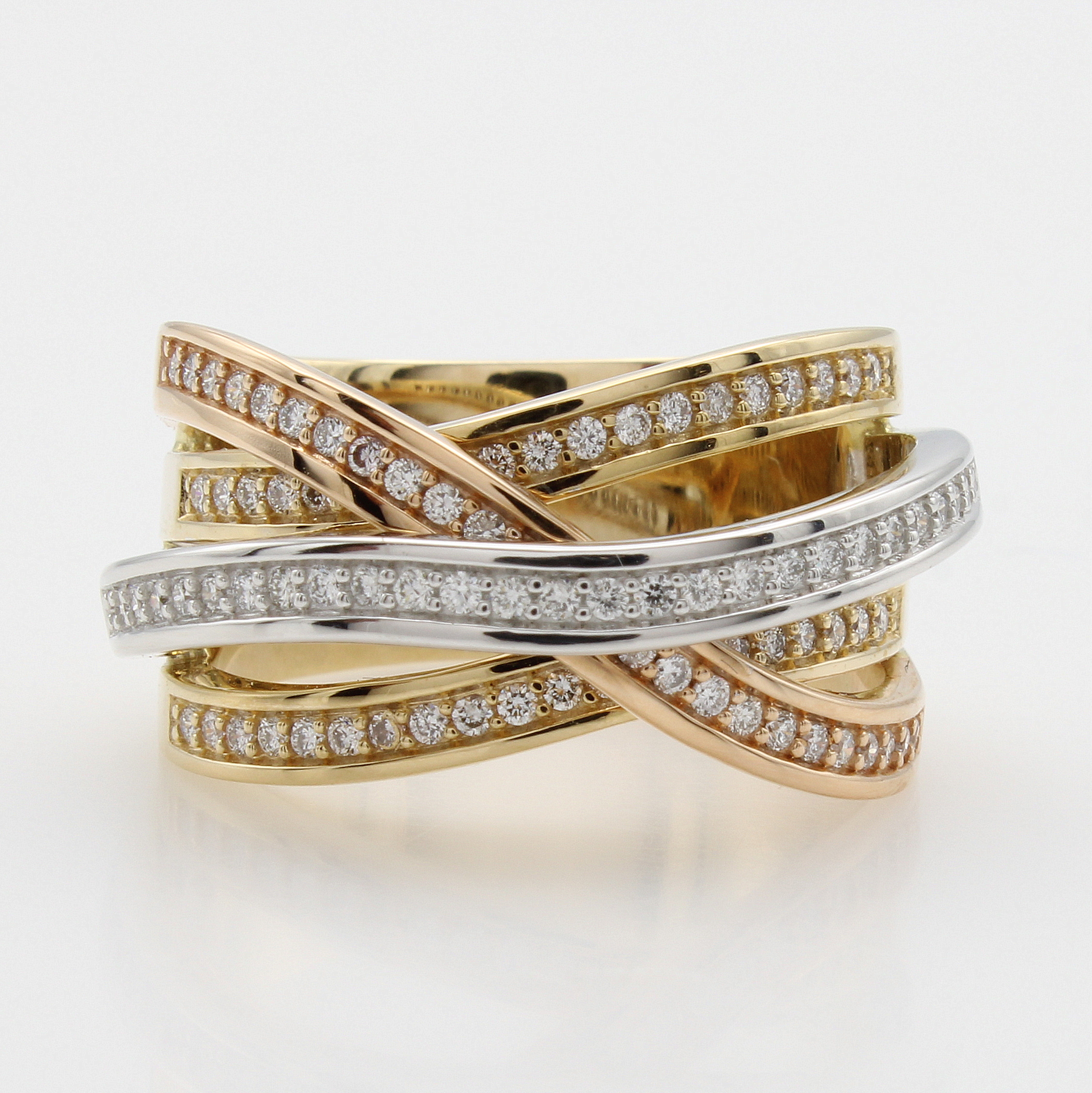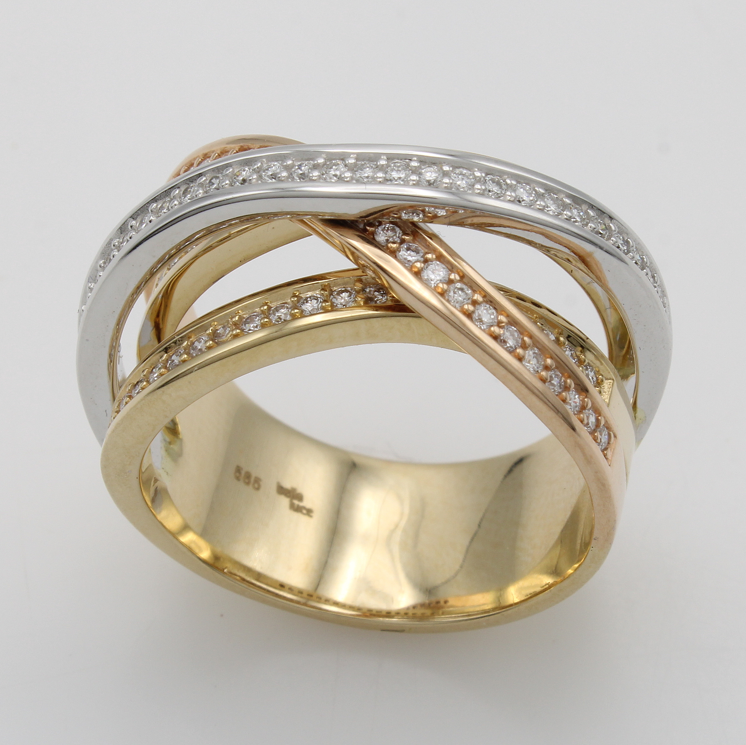 Ring mit Brillanten, GG/WG/RG 585/000, Brill. zus. ca. 0.55 ct Weiß/si, 4 reihiges, überschlagenes Design, RW ca. 56 Schätzpreis: 4700, - EUR