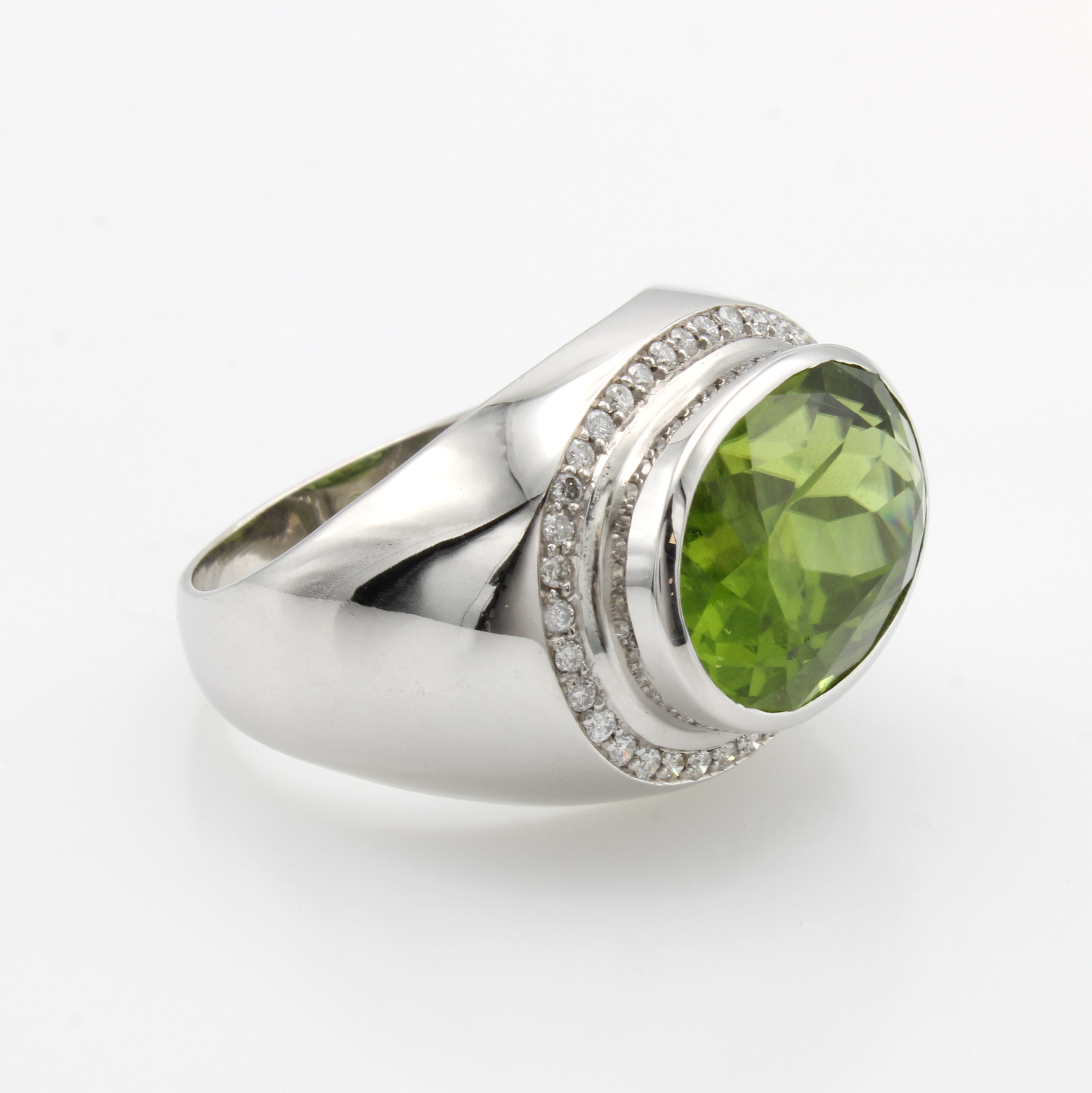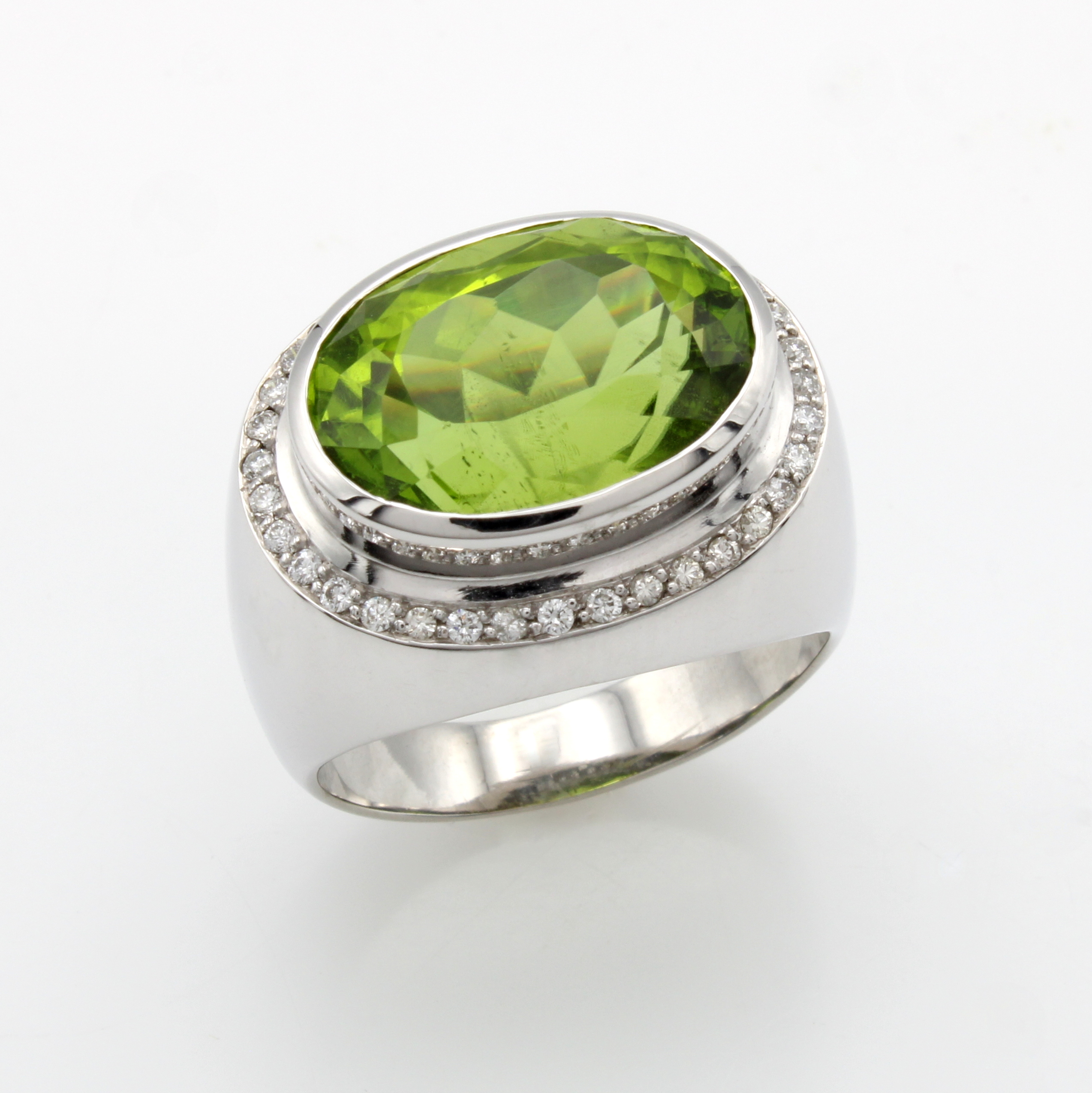 Ring mit Peridot und Brillanten, WG 750/000,fac. Peridot ca. 11.6 ct umgeben v. Brill. zus. ca. 0.31 ct feines Weiß/vs, RW ca. 59 Schätzpreis: 10500, - EUR