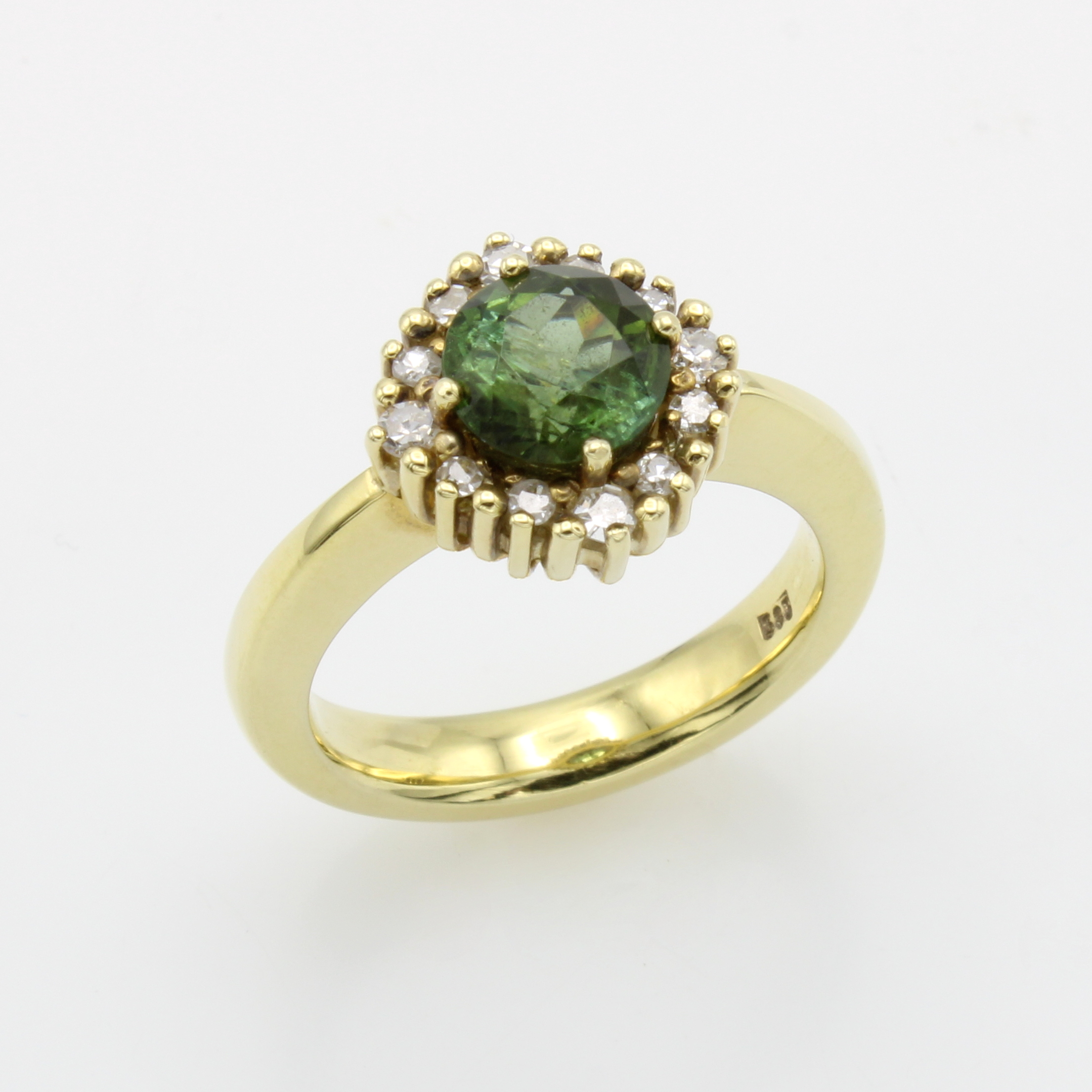 Ring mit Turmalin und Brillanten, GG 585/000,runder, fac. Turmalin ca. 1.6 ct umgeben v. Brill. zus. ca. 0.16 ct Weiß/si, RW ca. 54 Schätzpreis: 2500, - EUR