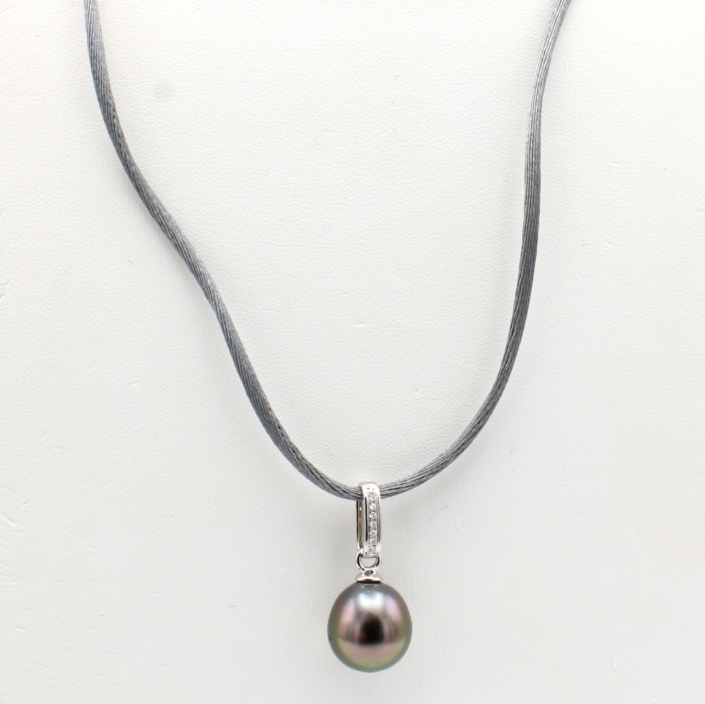 Anhänger mit Brillanten und Tahitizuchtperlen an Kordel, Schließe GG 750/000, tropfenf. Perle v. dunklem-grün irisierendem Lüster, D. ca. 12-13 mm, kl. Saphir in Perle integriert, L. ca. 45 cm Schätzpreis: 2000, - EUR