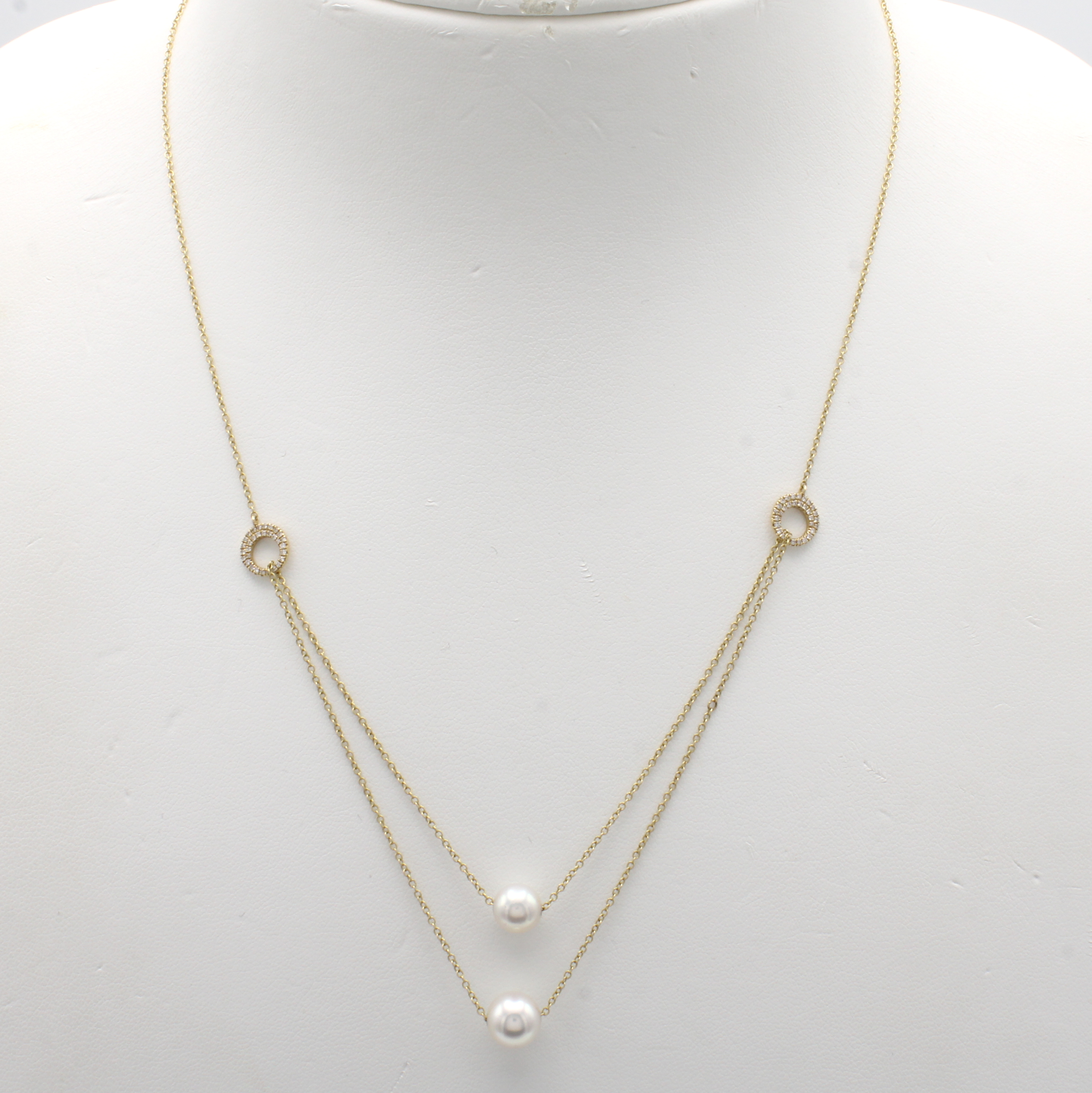 Kette mit Akoyazuchtperlen und Brillanten, GG 585/000, 2 weiße Perlen, D. ca. 7-8 mm, 62 Brill. zus. ca. 0.17 ct Weiß/si, in L. ca. 40 u. 45 cm tragbar Schätzpreis: 2400, - EUR