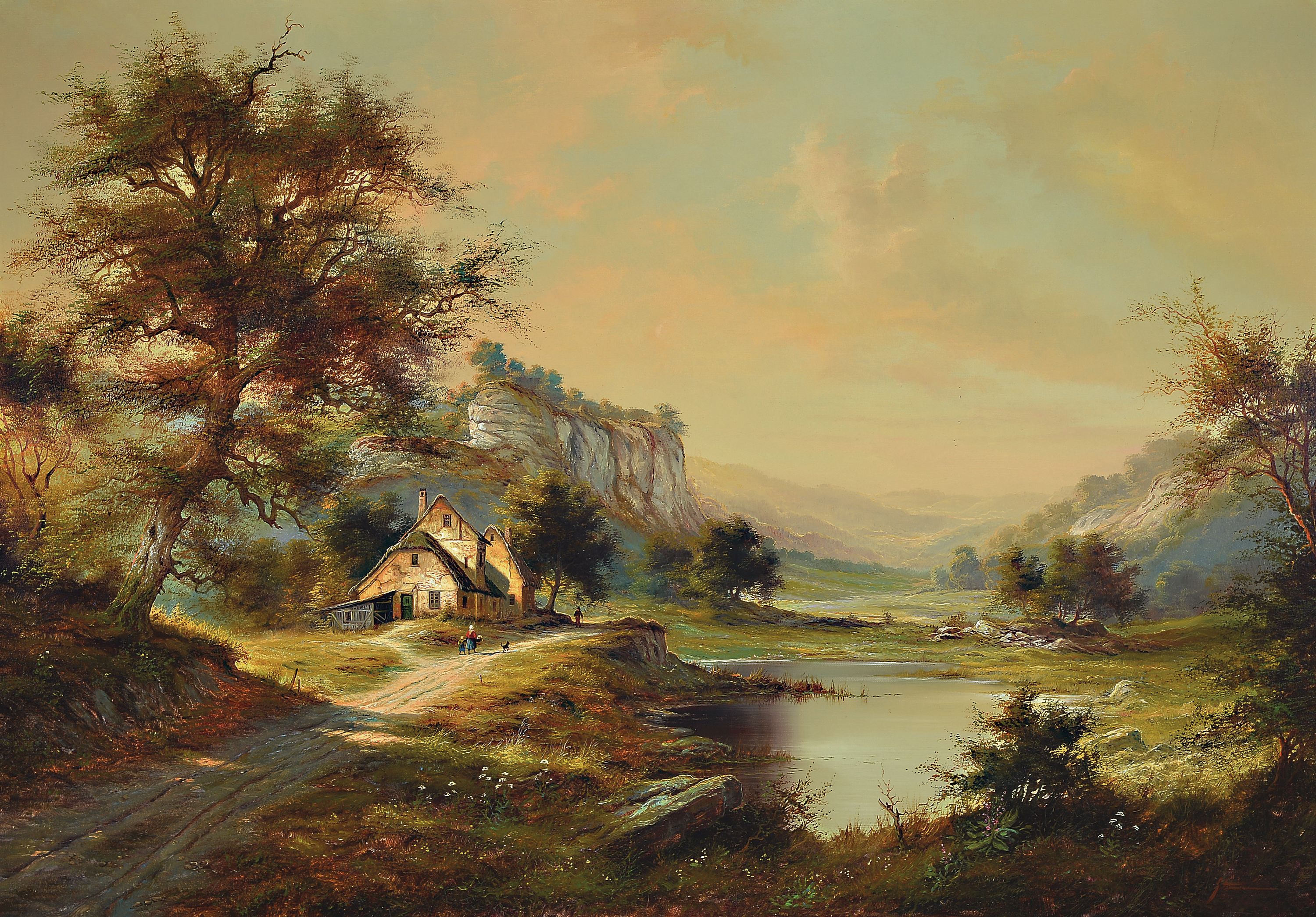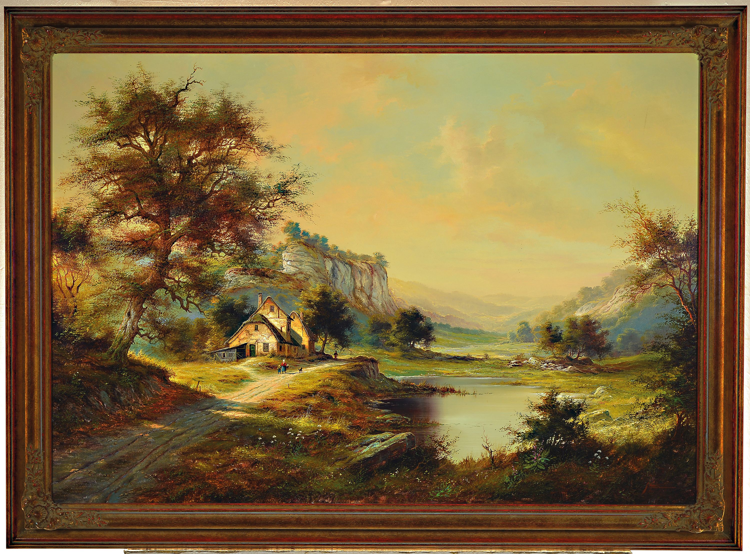 hier: ideale Landschaft mit Gewässer, Schlucht, Bauernhaus und Personen, Öl/Lwd,