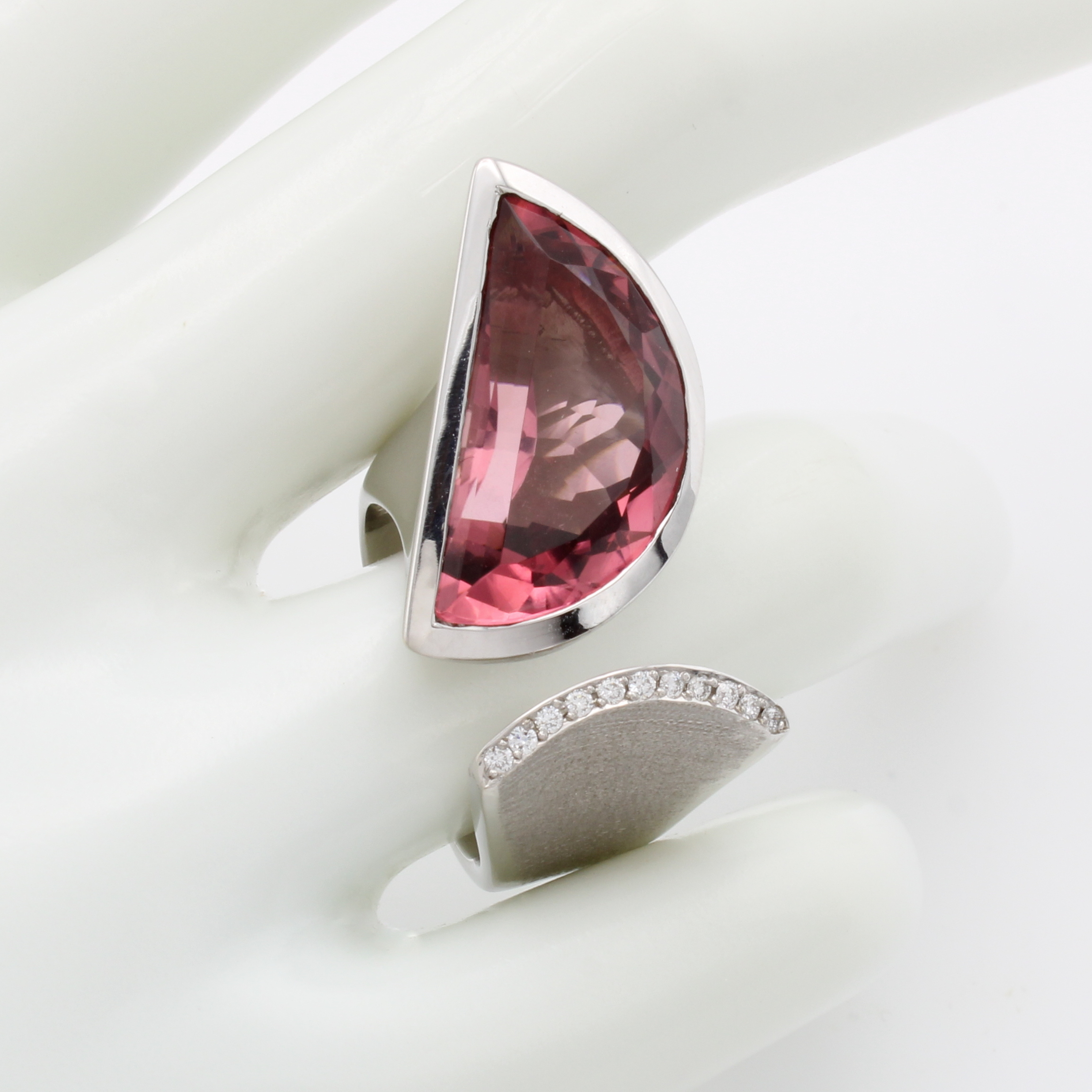 Ring mit Turmalin und Brillanten, WG 585/000, offen und z.T. matt. gearb., Turmalin als Halbkreis geschliffen ca. 9.93 ct, Brill. zus.ca. 0.07 ct feines Weiß/vs-si, RW ca. 56 Schätzpreis: 9500, - EUR