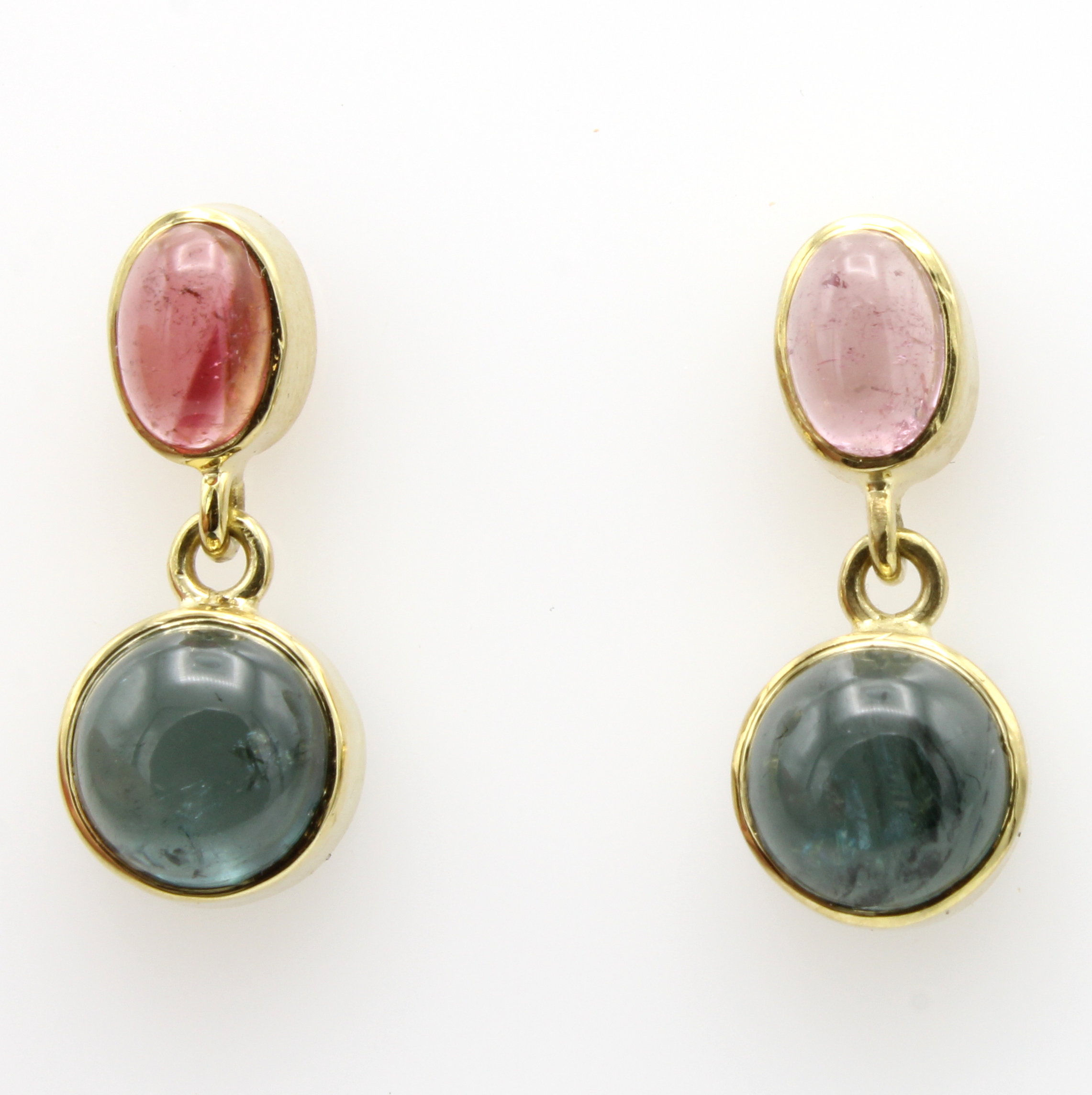 Paar Ohrstecker mit Turmalinen, 2 rosafarb.,ovale Turmalincabochons und 2 grüne, runde Turmalincabochons zus. ca. 6.05 ct, bewegl. gearb. Schätzpreis: 1600, - EUR