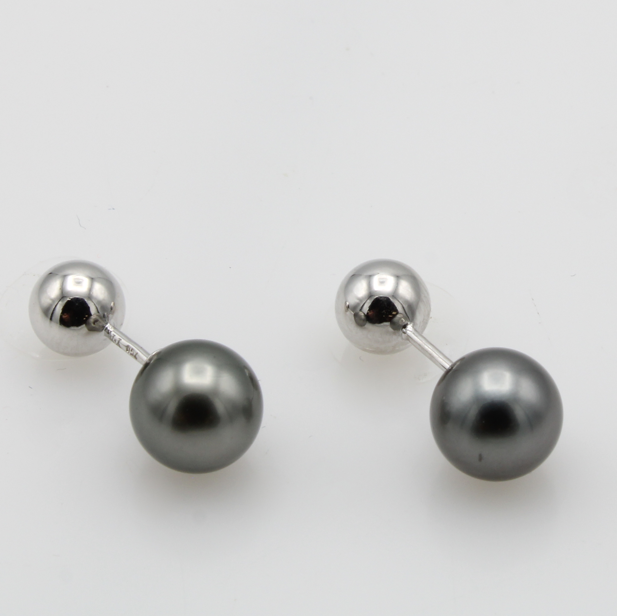 Paar Ohrstecker "Double face" mit Tahiti- zuchtperlen, WG 750/000, 2 dunkle Perlen, D.ca. 8-9 mm, 1 kl. Saphir in Perle integriert Schätzpreis: 1800, - EUR