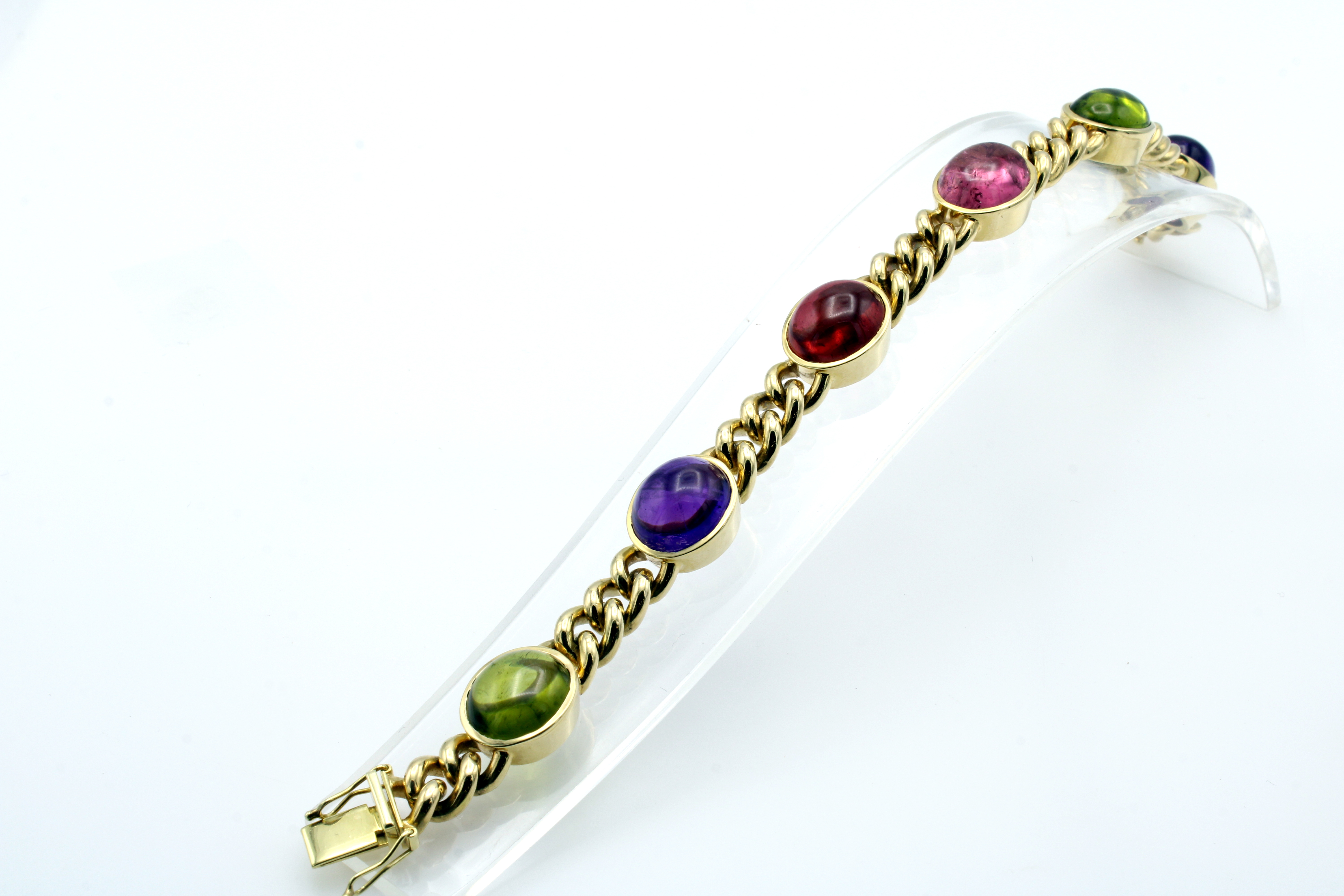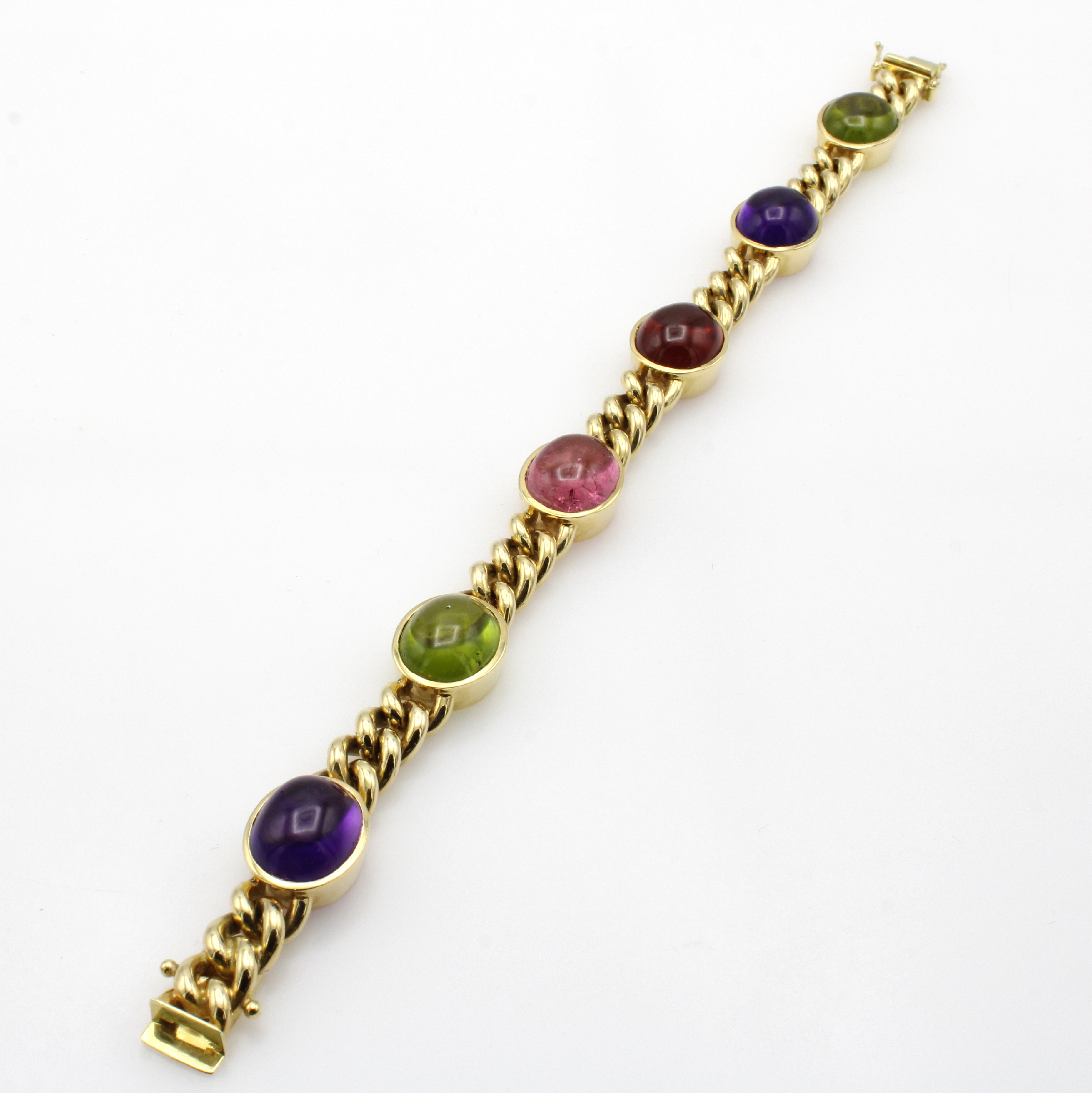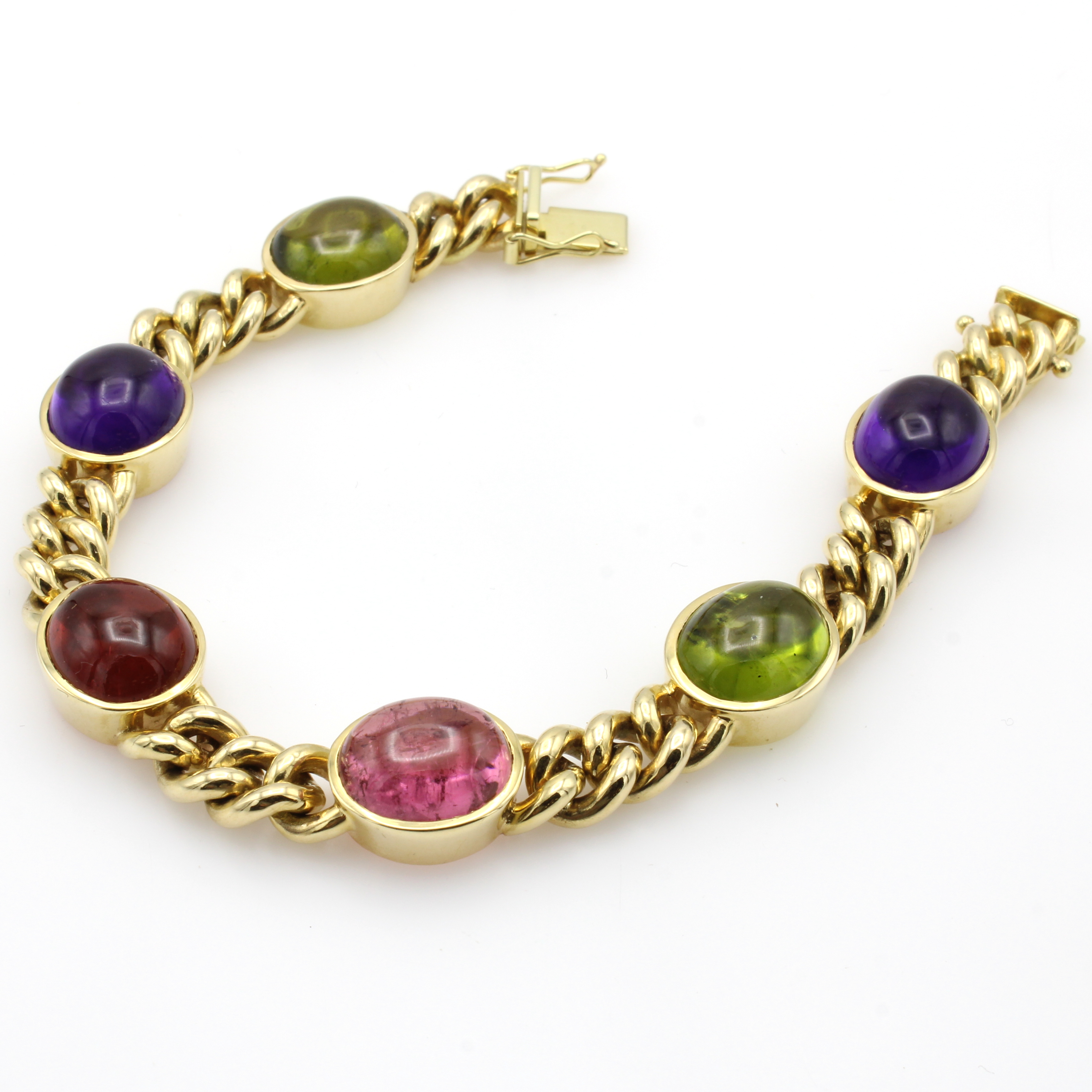 Panzerarmband mit Farbsteincabochons, GG 585/000, Turmaline, Amethyste und Peridots zus. ca. 54.5 ct, Kastenschl. mit zwei Sicherheitsachten, L. ca. 21 cm Schätzpreis: 19800, - EUR