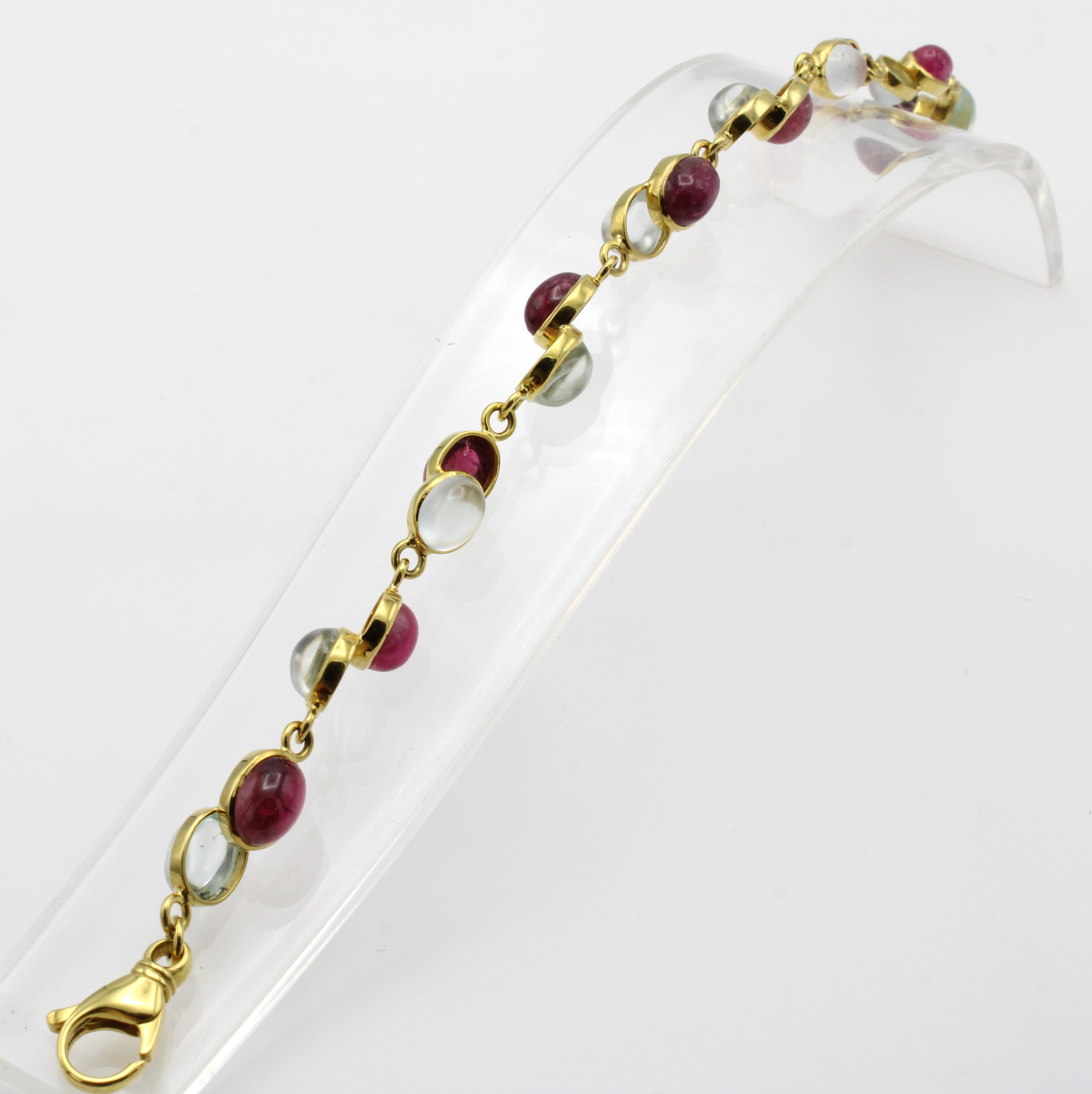 Armband mit Farbsteinen, GG 585/000, ovale Cabochons, pinkfarb. Turmaline und Aquamarine zus. ca. 35.9 ct, Karabinerschl., L. ca. 21 cm Schätzpreis: 5600, - EUR