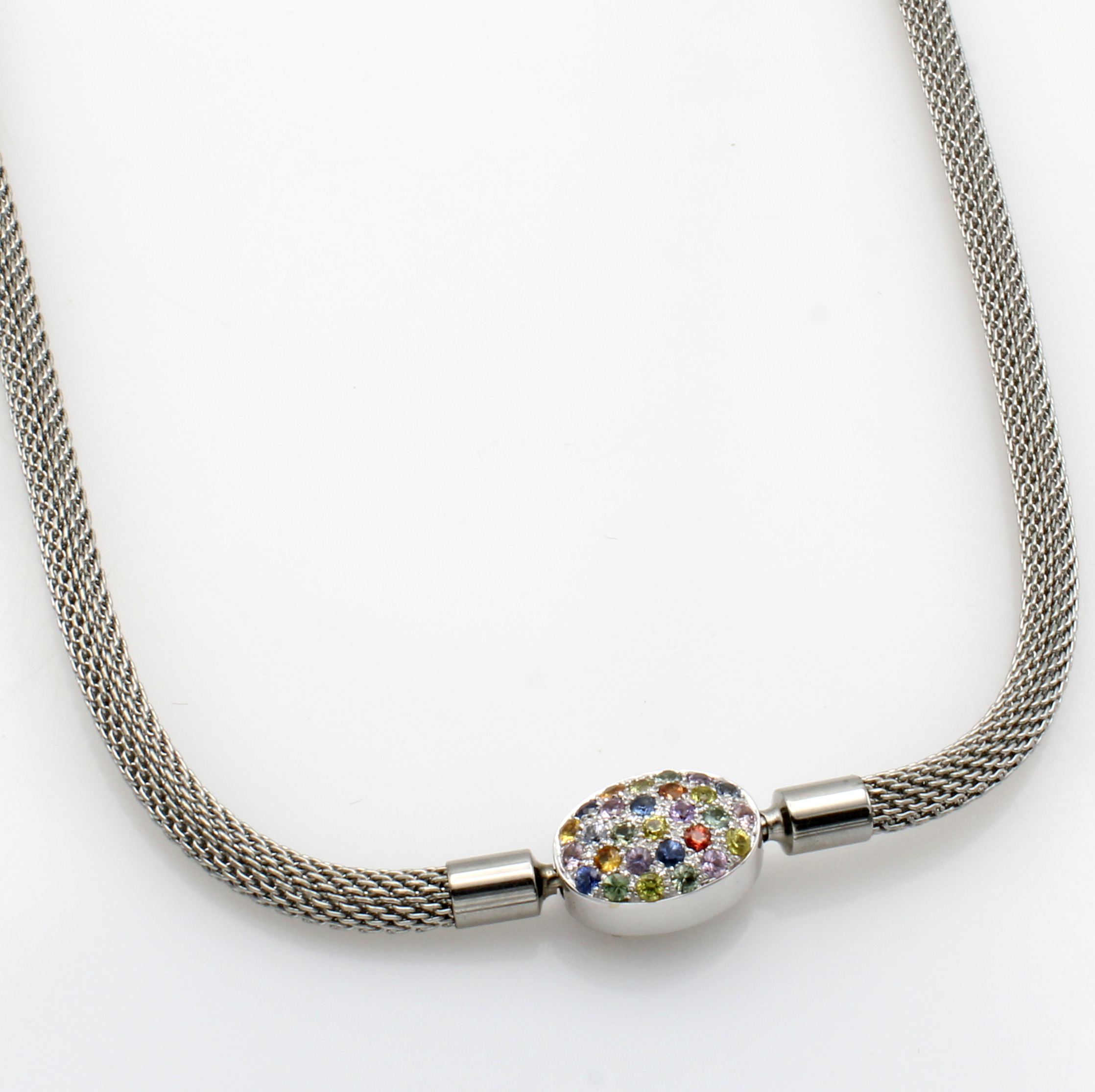 Wechselschließe mit Farbsteinen an Edelstahl- kette, WG 750/000, bunte Saphire u. Chrom- Diopside, L. ca. 44 cm Schätzpreis: 2700, - EUR