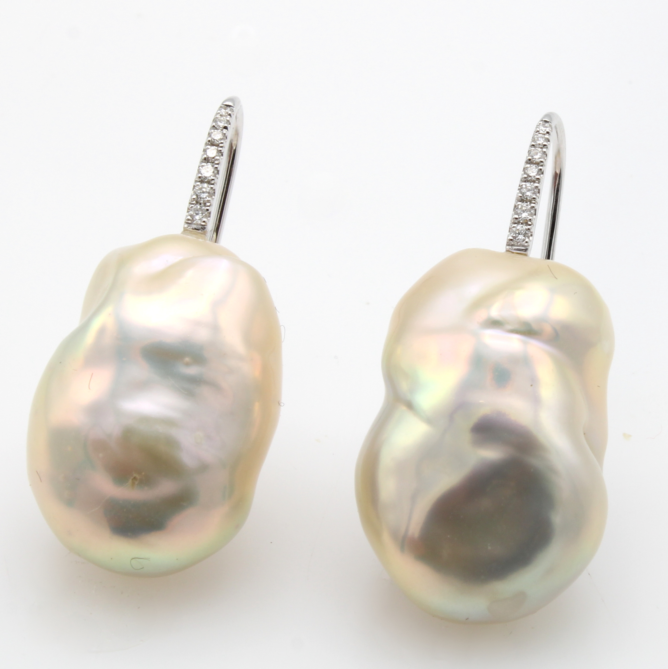 Paar Ohrgehänge mit Keshiperlen und Brillanten, WG 750/000, Brill. zus. ca. 0.12 ct Weiß/ si, barocke Perlen, D. ca. 15-18 mm, 1 kl. Saphir in Perle integriert Schätzpreis: 1600, - EUR
