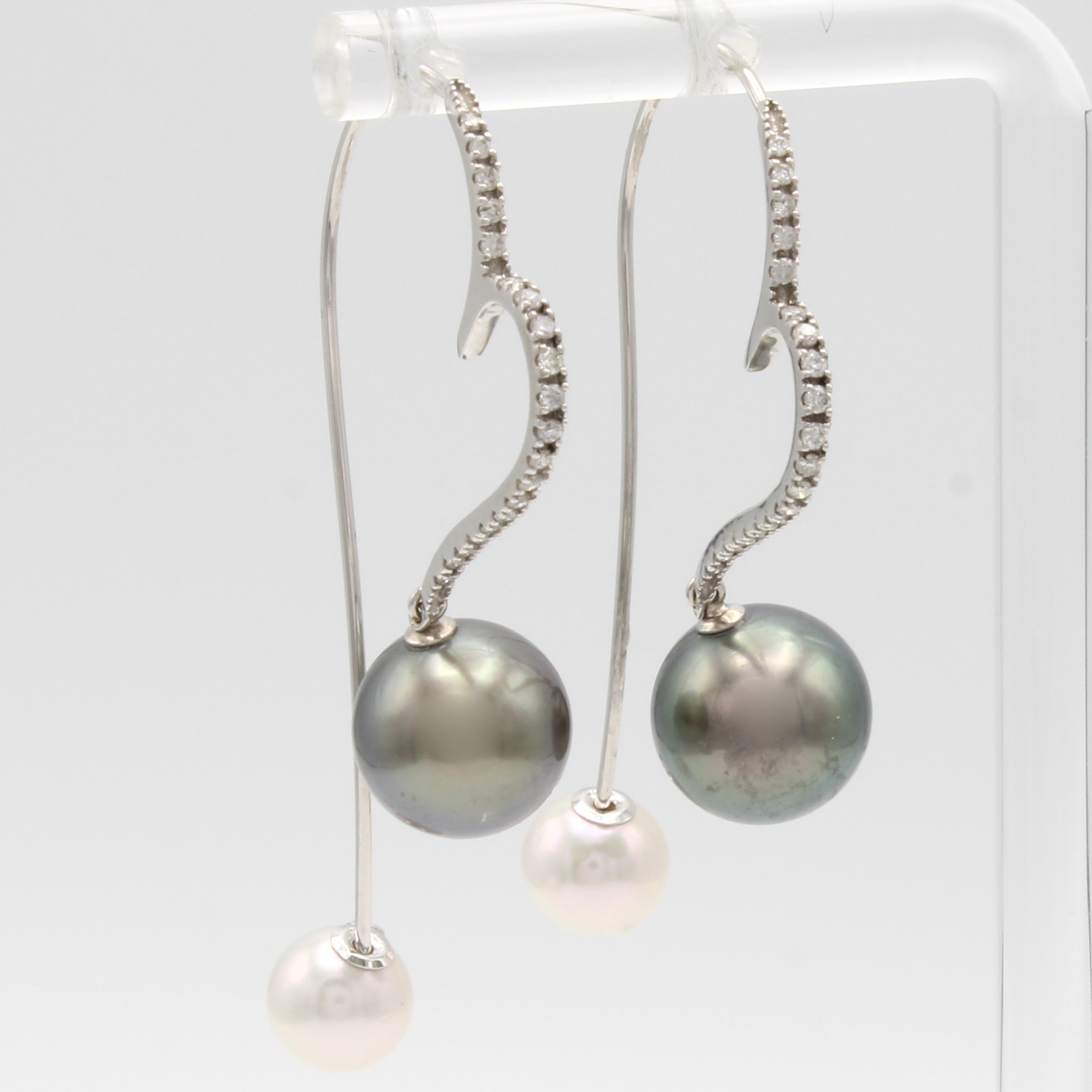 Paar Ohrgehänge mit Brillanten, Tahiti- und Süßwasserzuchtperlen, WG 750/000, 40 Brill. zus. ca. 0.25 ct Weiß/si-p, Perld. ca. 7-11 mm Schätzpreis: 3800, - EUR