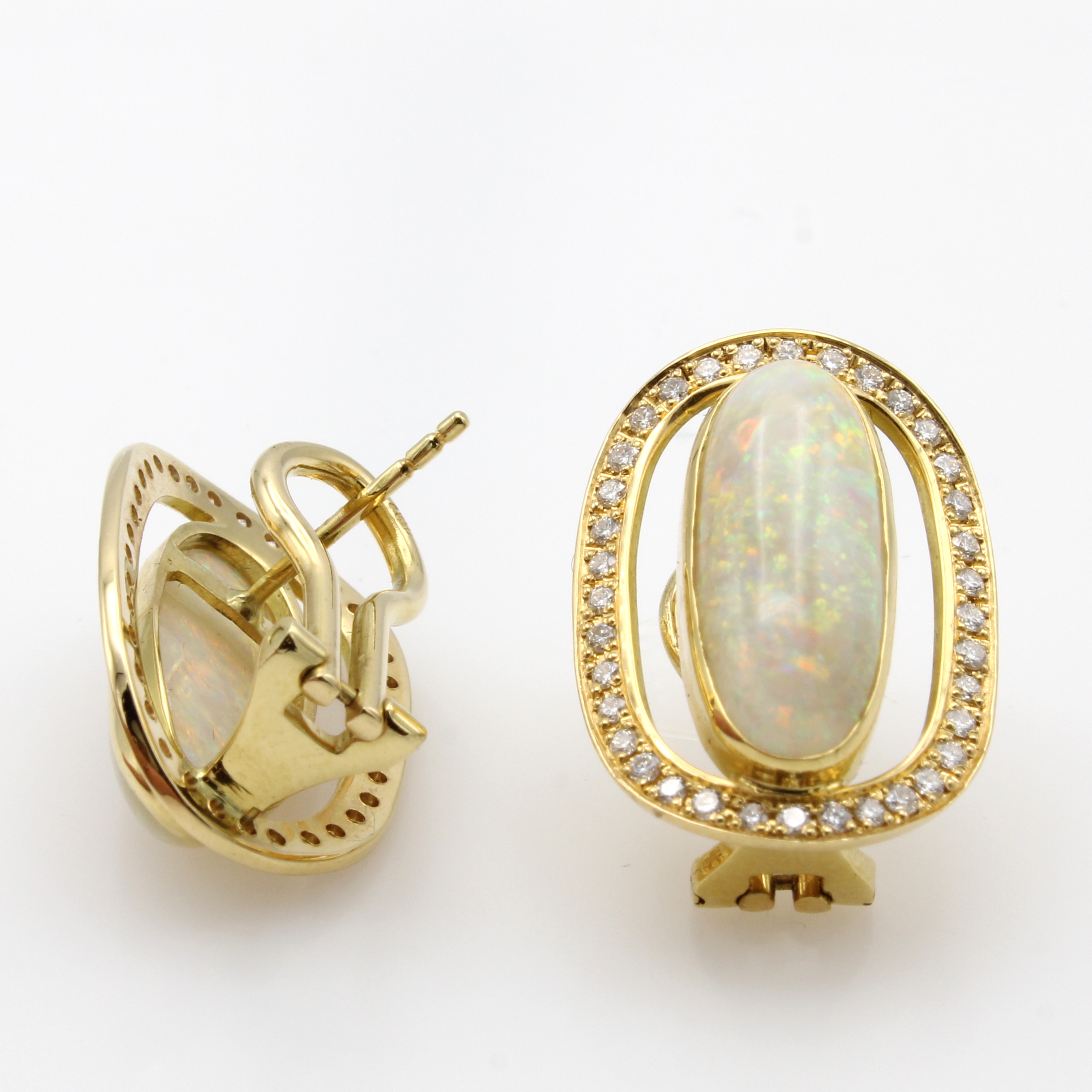 Paar Ohrstecker mit Opalen und Brillanten, GG 750/000, ovale Opalcabochons zus. ca. 6.6 ct, Brill. zus. ca. 0.60 ct feines Weiß/vs-si,m. Clipbrisur Schätzpreis: 6000, - EUR