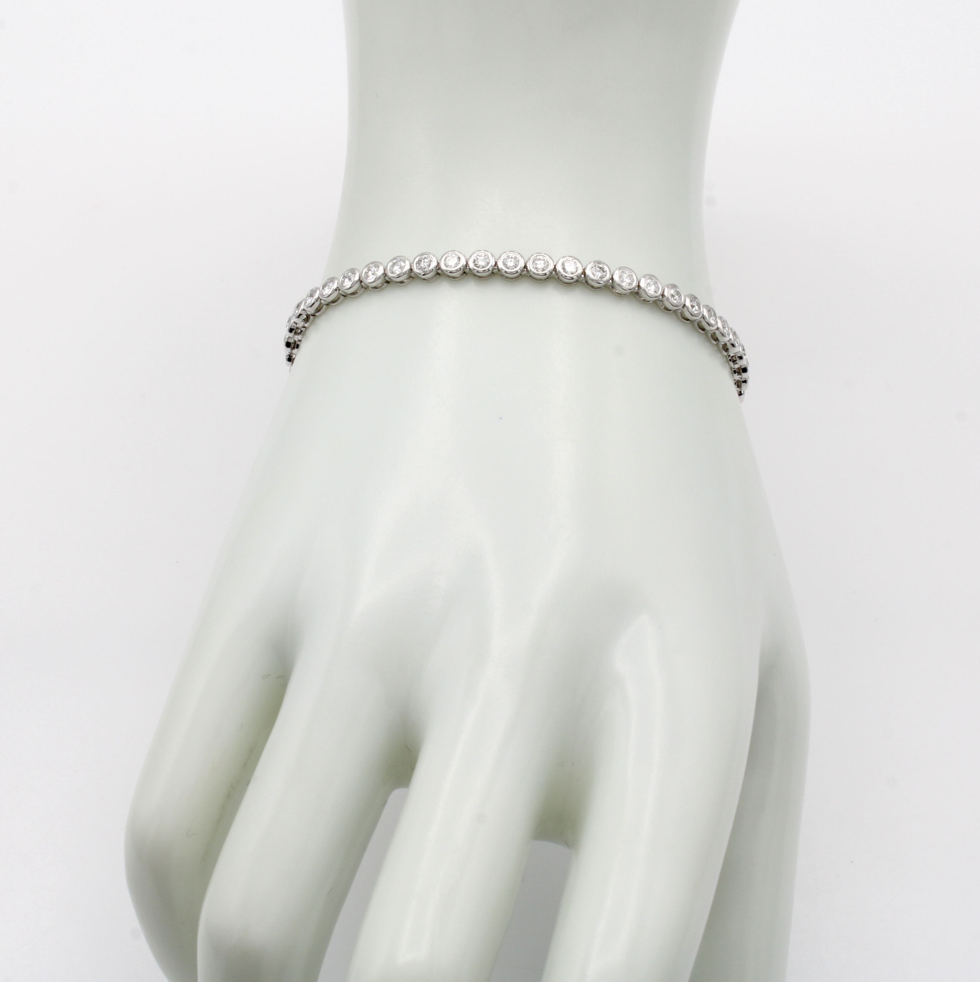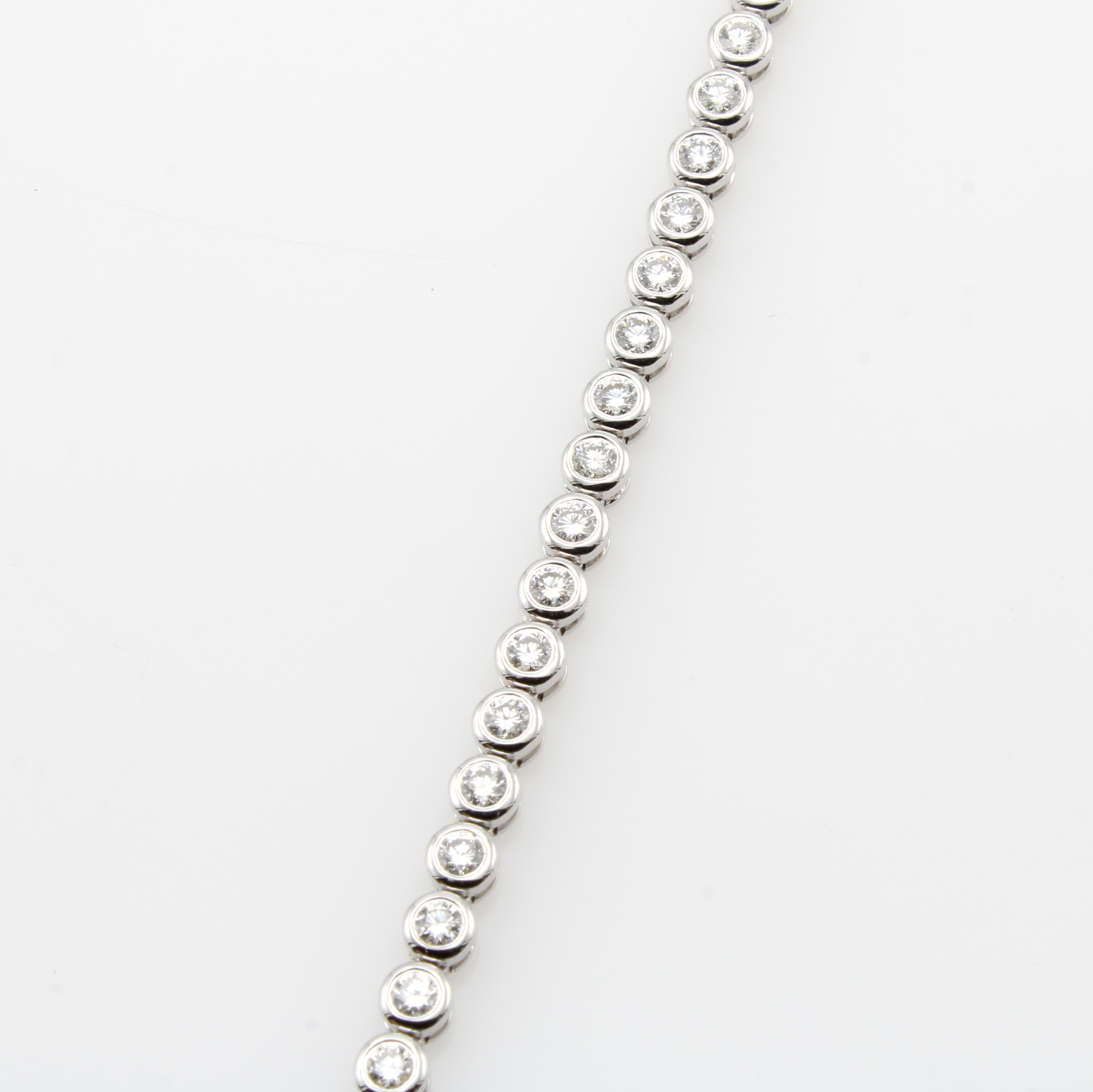 Tennisarmband mit Brillanten, WG 750/000, Brill. zus. ca. 2 ct feines Weiß/si, Kasten- schließe m. doppelter Sicherheitsacht, L. ca. 18 cm Schätzpreis: 7700, - EUR