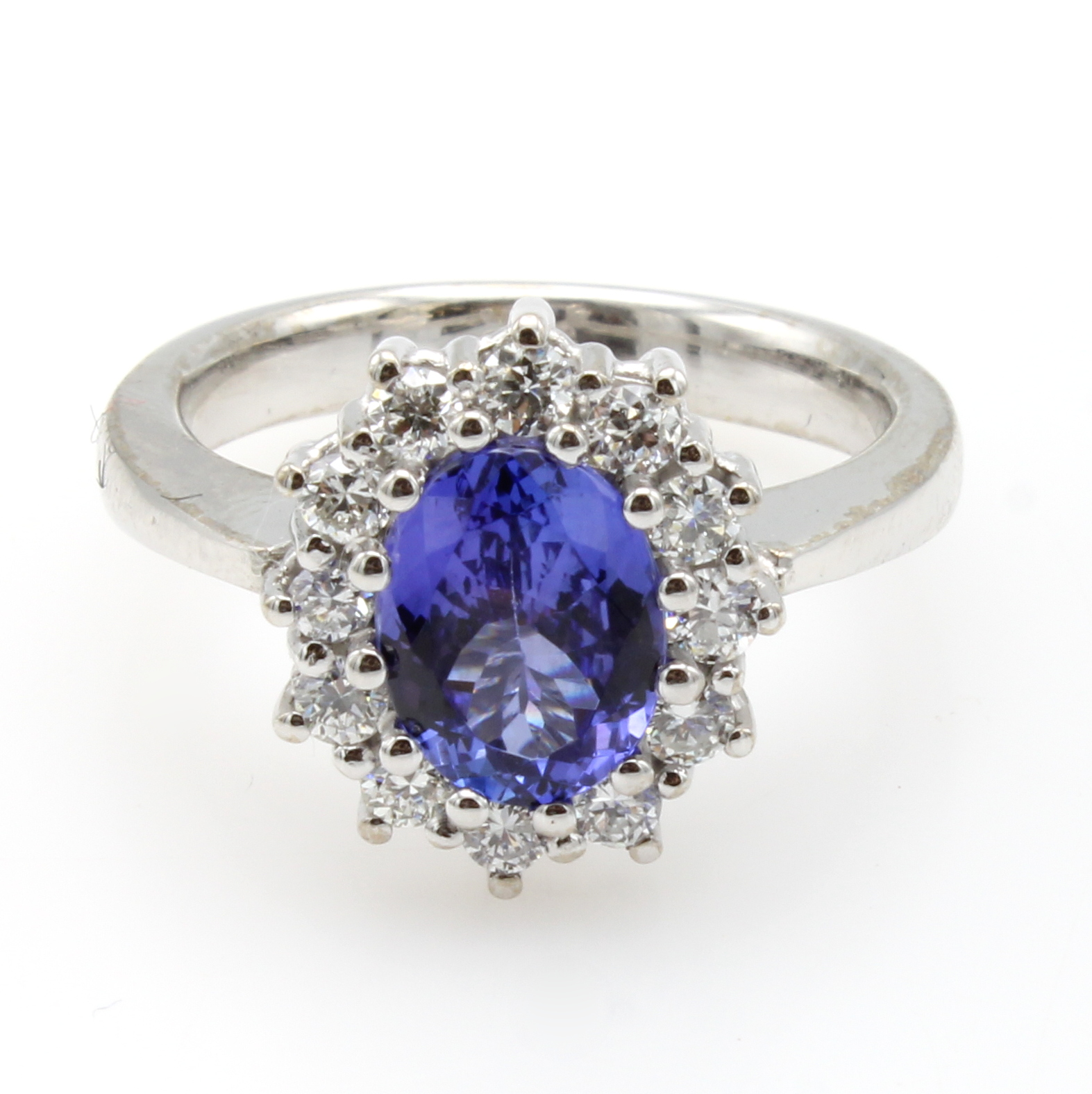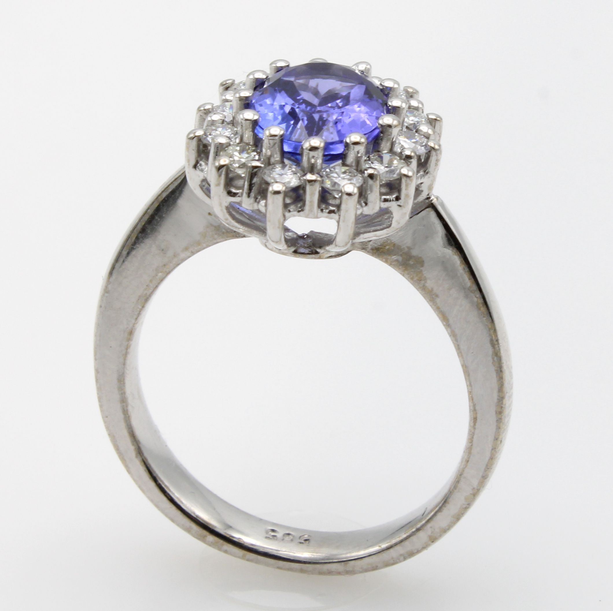 Ring mit Tansanit und Diamanten, WG 585/000,ovaler, fac. Tansanit ca. 2 ct umgeben v. Diam. im Altschliff zus. ca. 0.54 ct feines Weiß/vs-si, RW ca. 56 Schätzpreis: 3980, - EUR