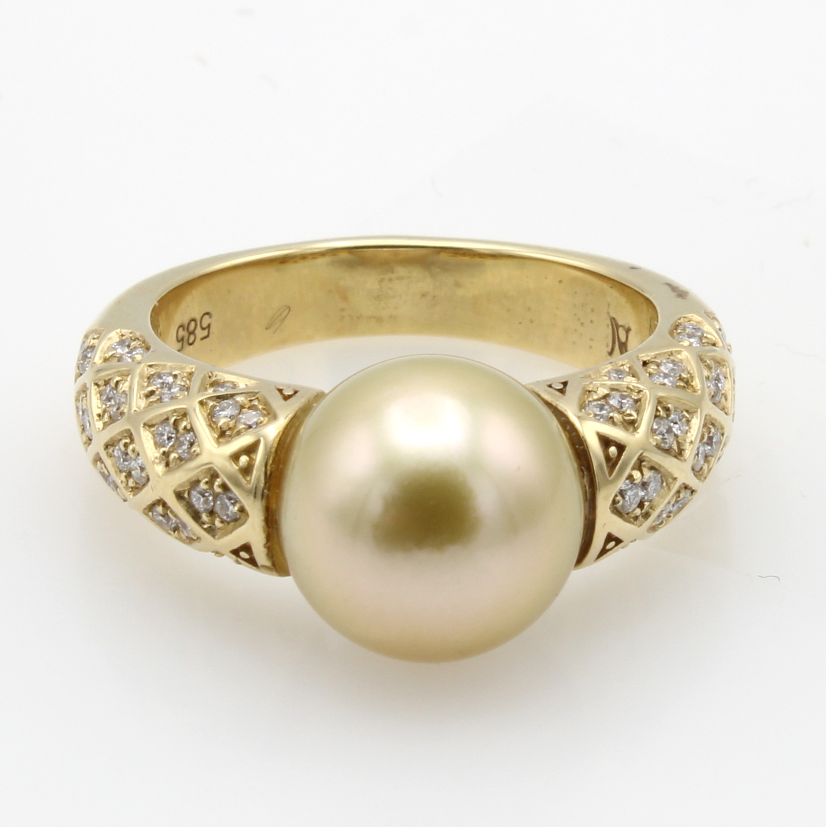 Ring mit Südseezuchtperle und Brillanten, GG585/000, 68 Brill. zus. ca. 0.33 ct Weiß/si, champagnerfarb. Perle, 1 kl. Saphir in Perle integriert, D. ca. 10-11 mm, RW ca. 55 Schätzpreis: 5000, - EUR