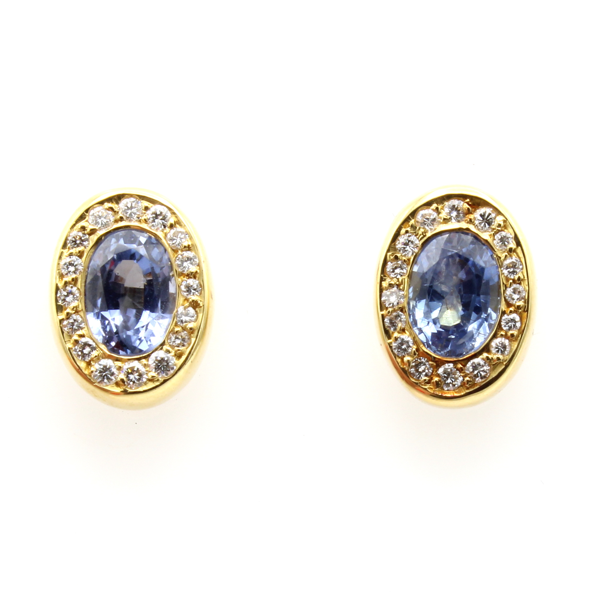 Paar Ohrstecker mit Saphiren und Brillanten, GG 750/000, fac. Saphire zus. ca. 3.72 ct umgeben v. Brill. zus. ca. 0.34 ct feines Weiß/si Schätzpreis: 4200, - EUR