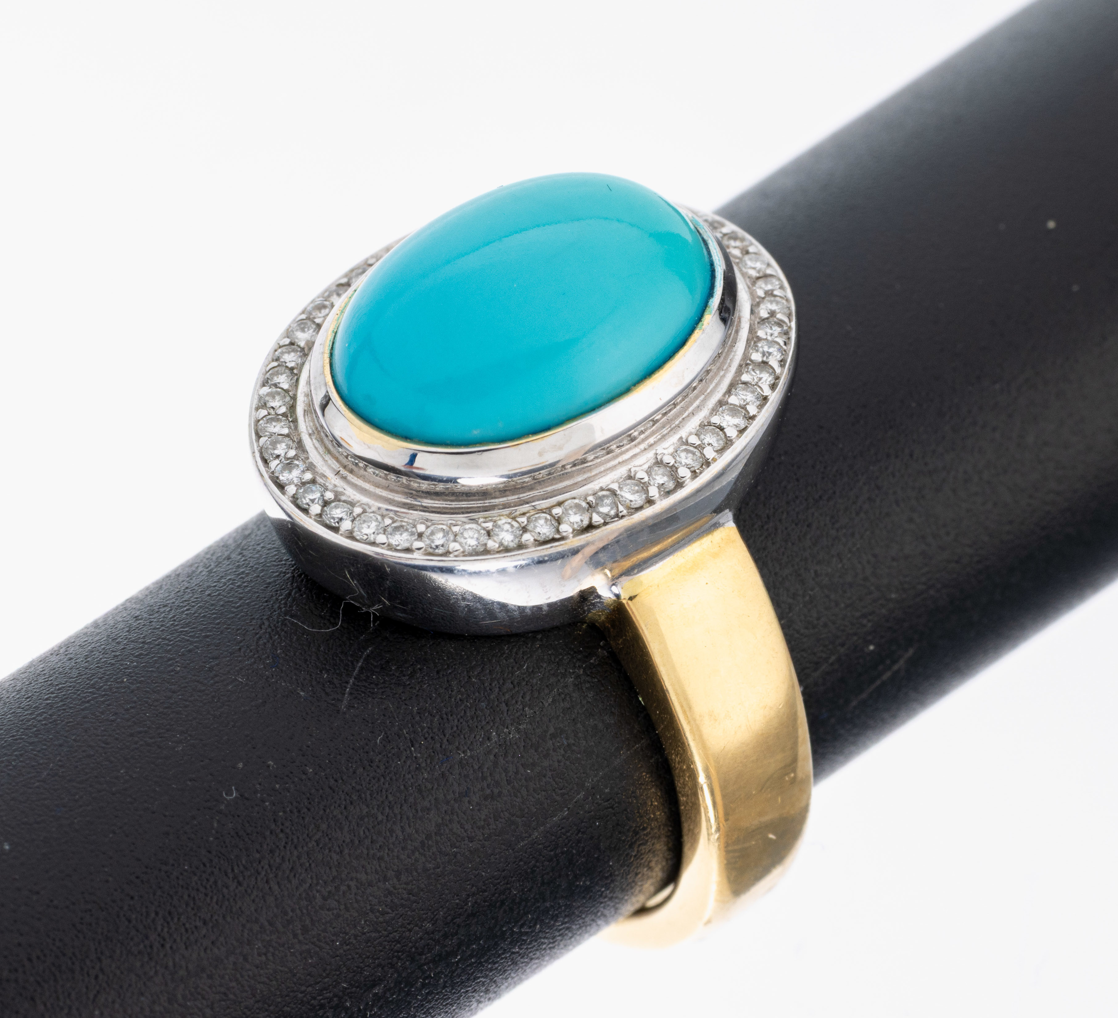 Ringkopf, ovaler Türkis-Cabochon, umgeben von 44 Brillanten zus. ca. 0.25 ct Weiß/si,