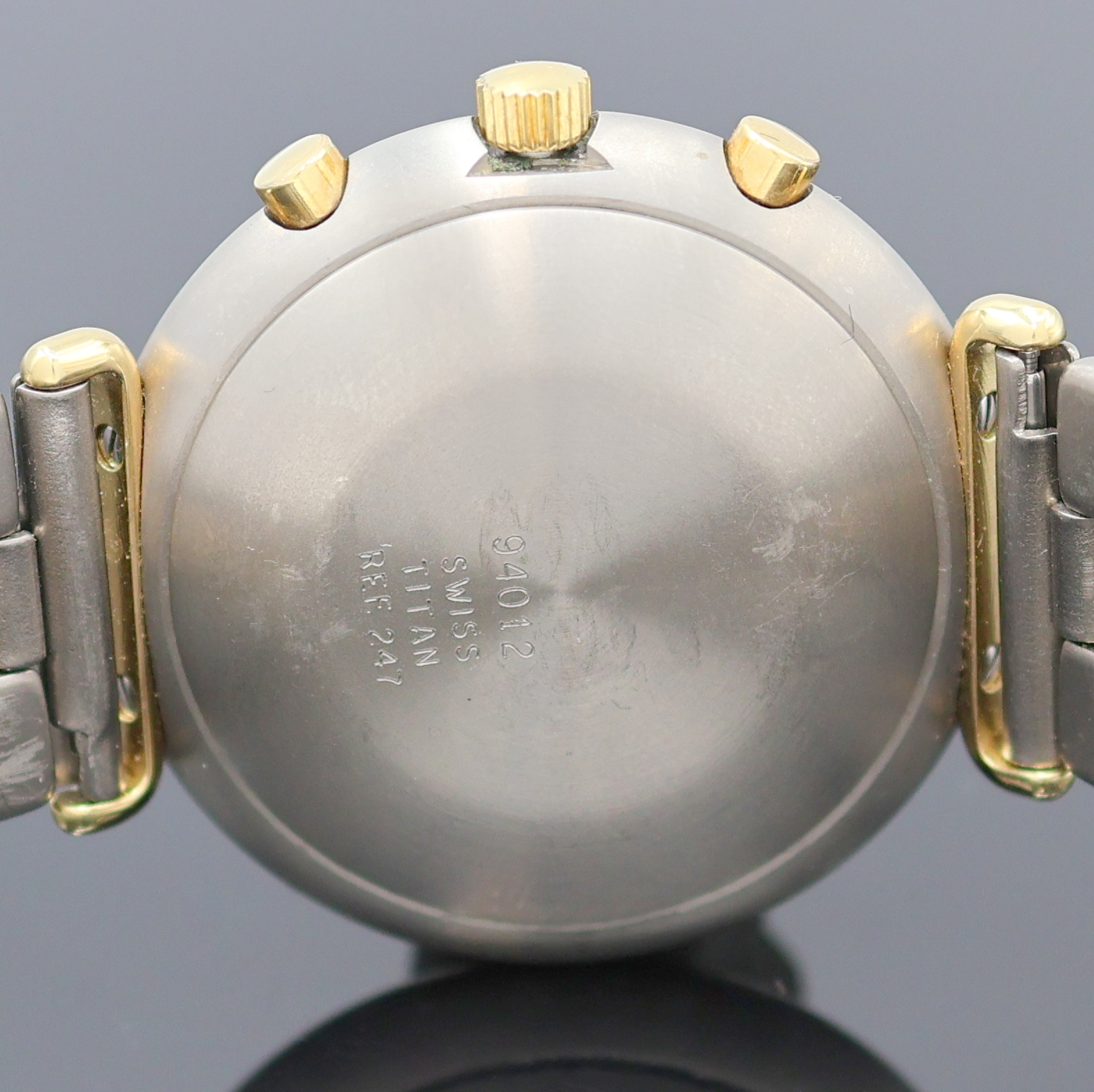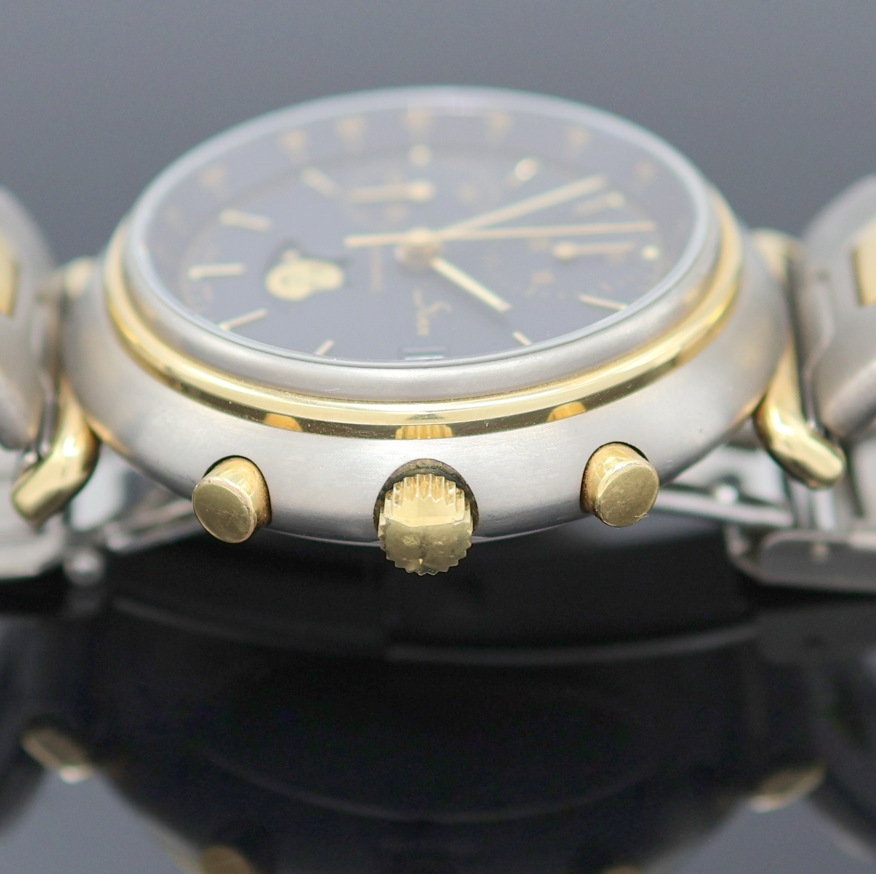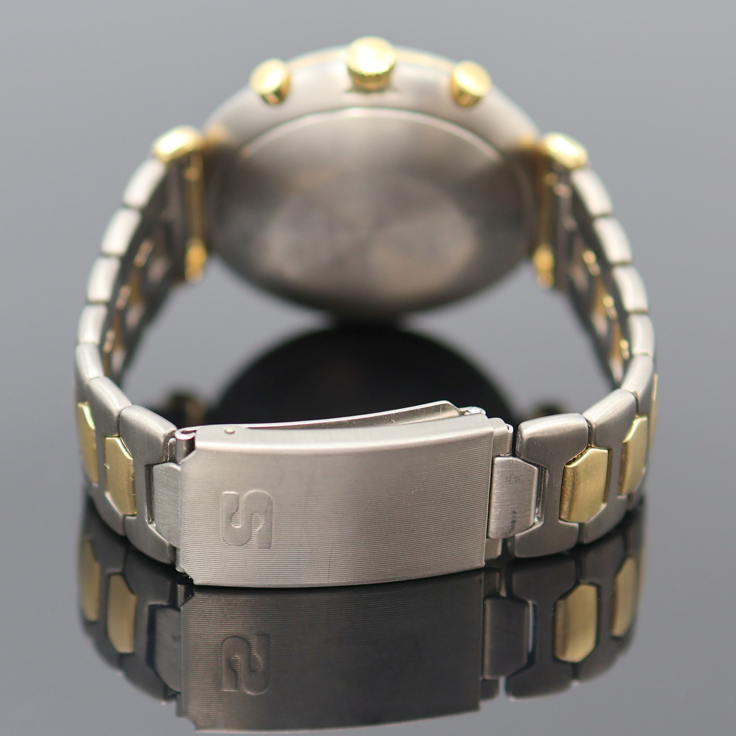 inkl. orig. Gliederband m. Faltschl., Boden gedr., schwarzes Zifferbl. m. aufges.