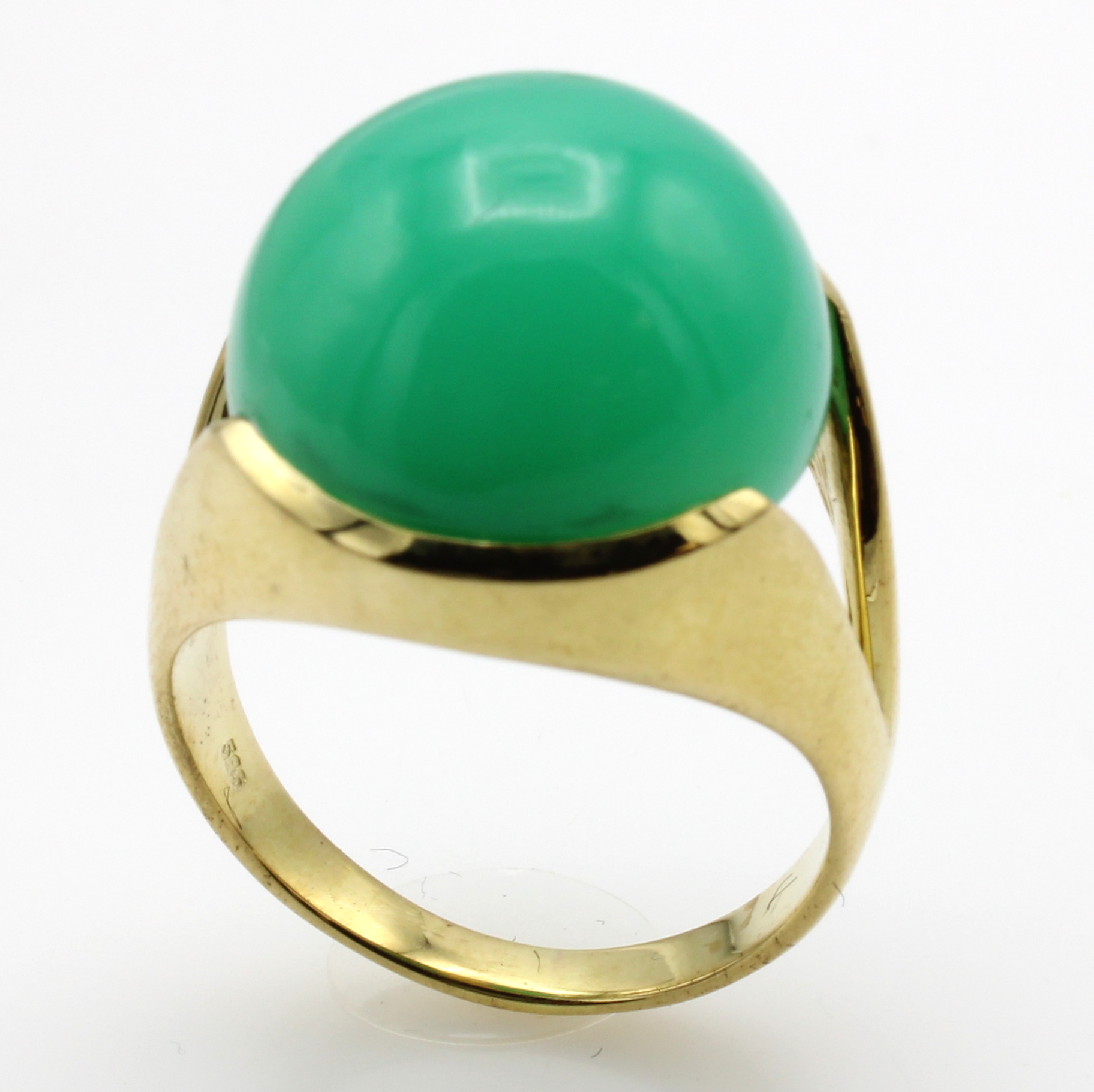 Ring mit Chrysopras, GG 585/000, geteilte Ringschiene, runder Chrysoprascabochon ca. 20.02 ct, RW ca. 59 Schätzpreis: 2600, - EUR