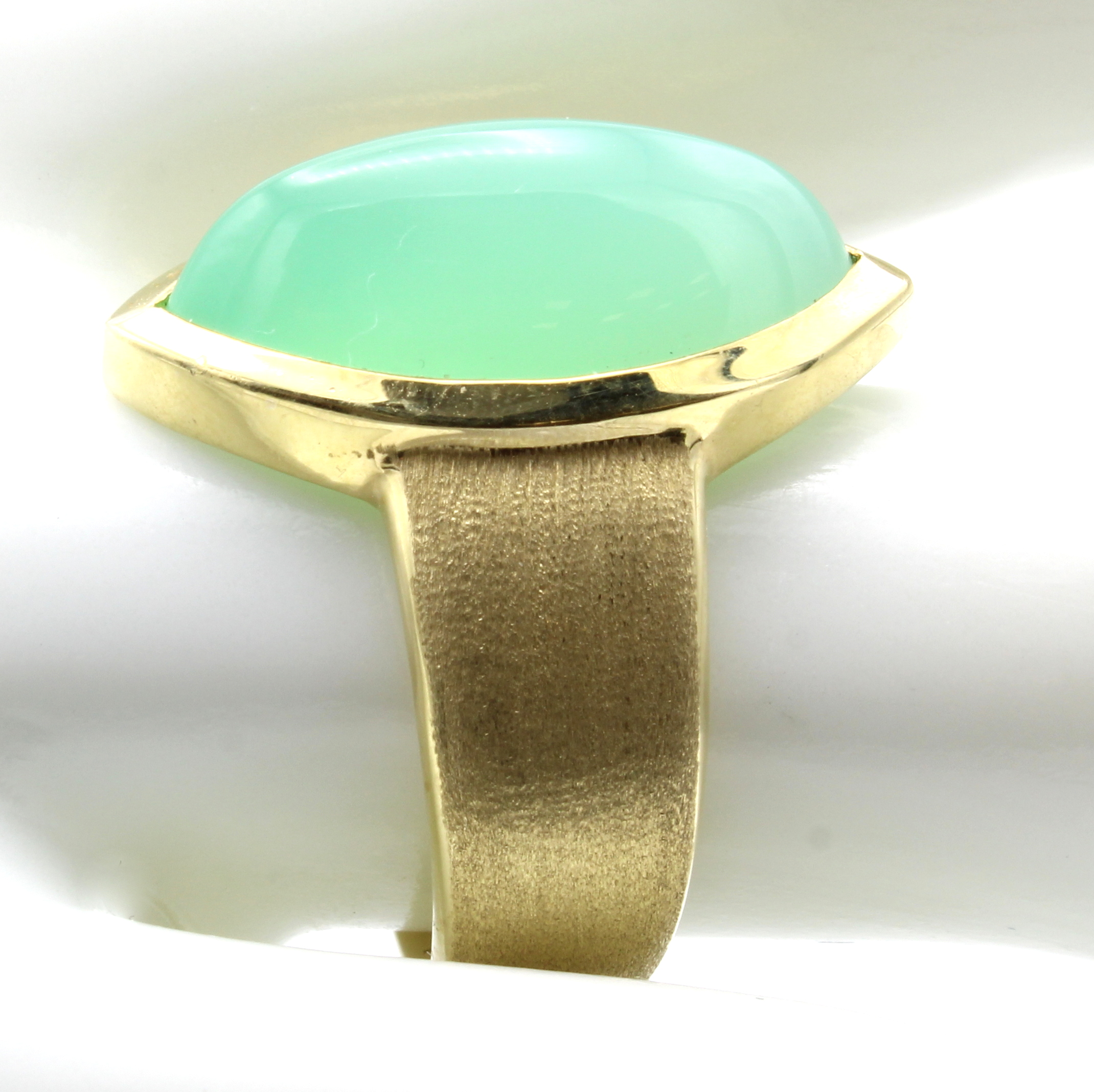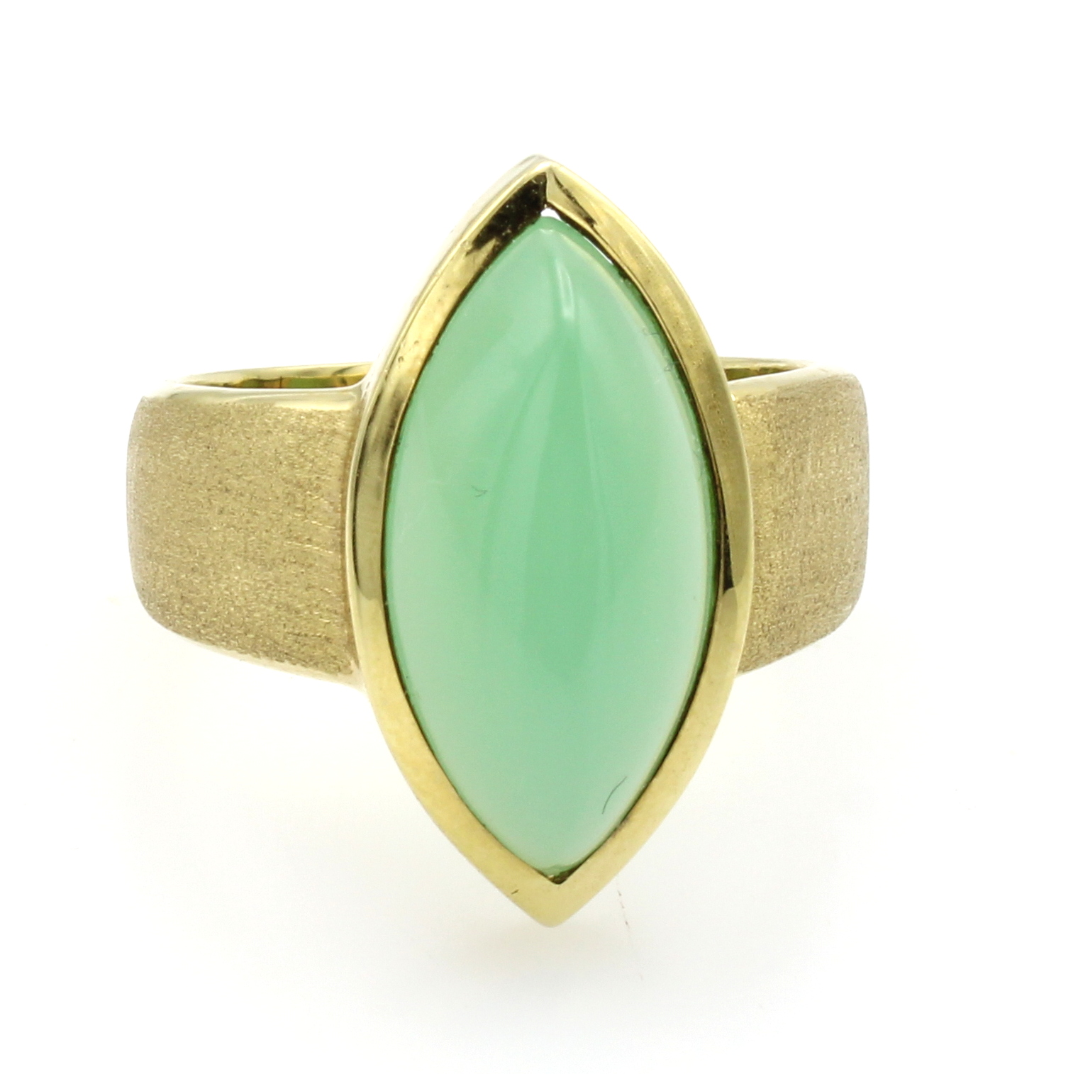 Ring mit Chrysopras, GG 585/000, mattierte Ringschiene, Chrysoprasnavette im Cabochon- schliff ca. 9.5 ct, RW ca. 56 Schätzpreis: 2600, - EUR