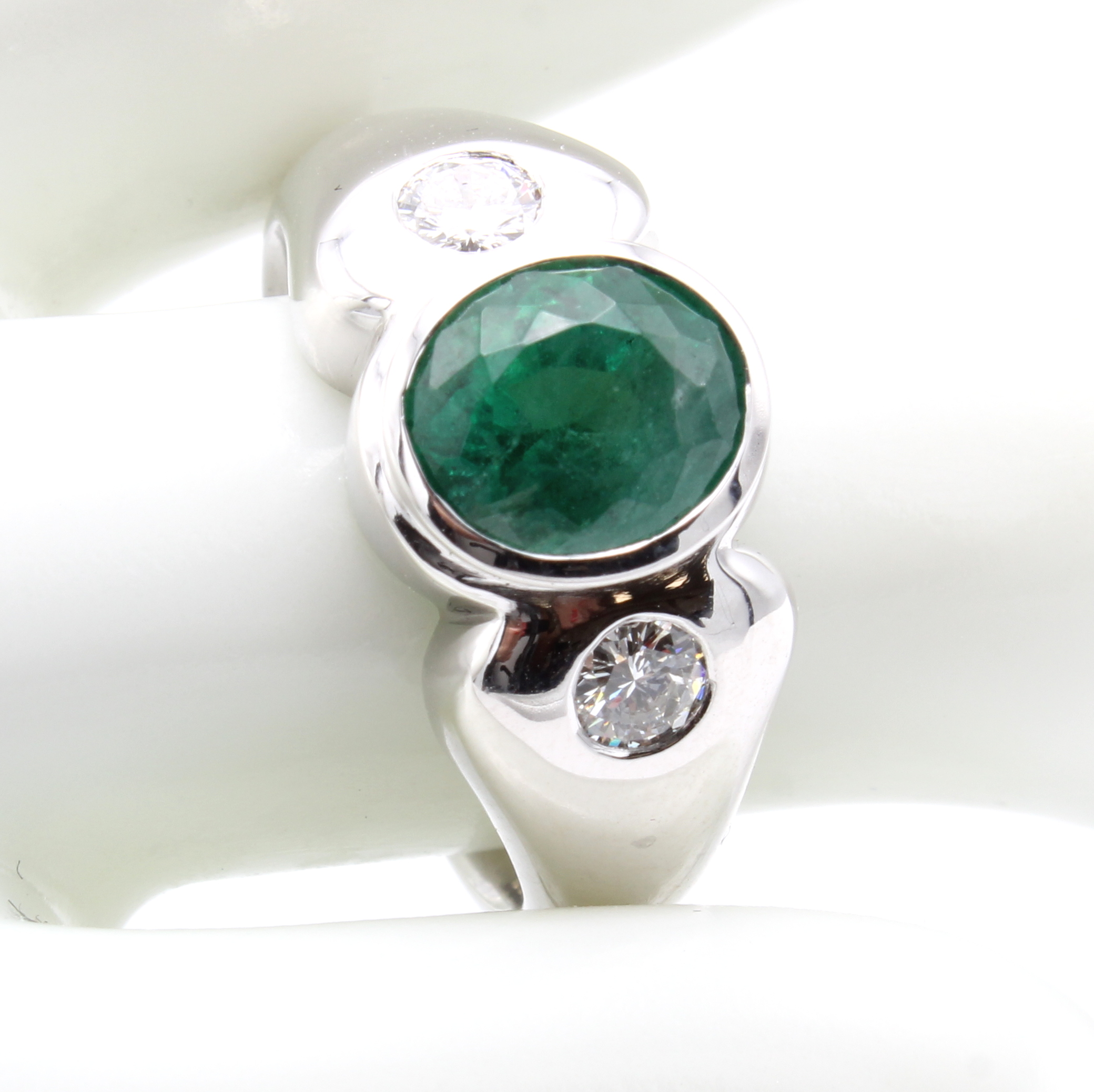 Ring mit Smaragd und Brillanten, WG 750/000,runder, fac. Smaragd ca. 2.29 ct, 2 Brill. zus. ca. 0.33 ct hochfeines Weiß/vvs, RW ca. 57 Schätzpreis: 8000, - EUR