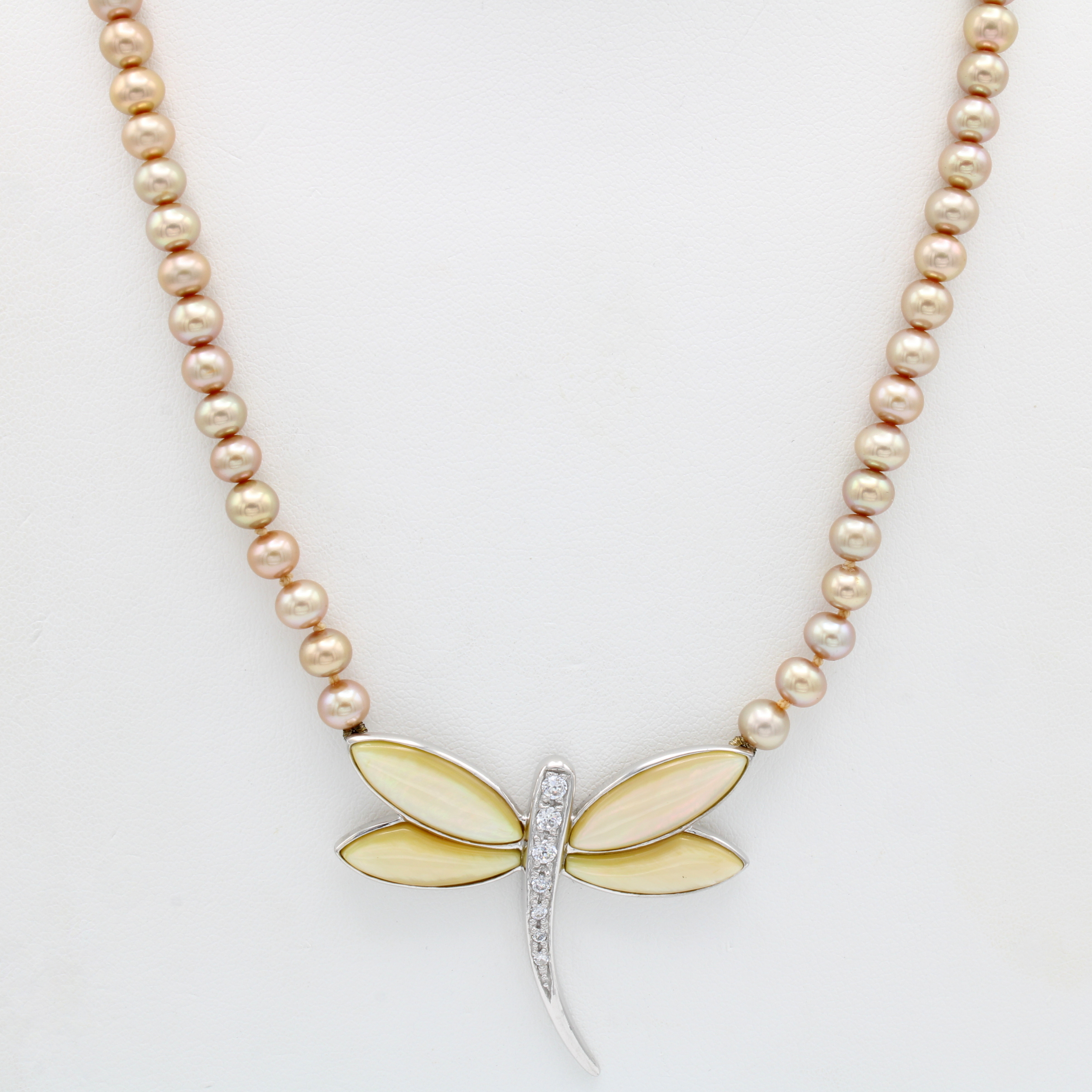 Süßwasserzuchtperlenkette "Libelle" mit Perlmutt und Zirkonia, 925er Silber, champagnerfarb. Perlen ca. 5-6 mm, L. ca. 45 cm