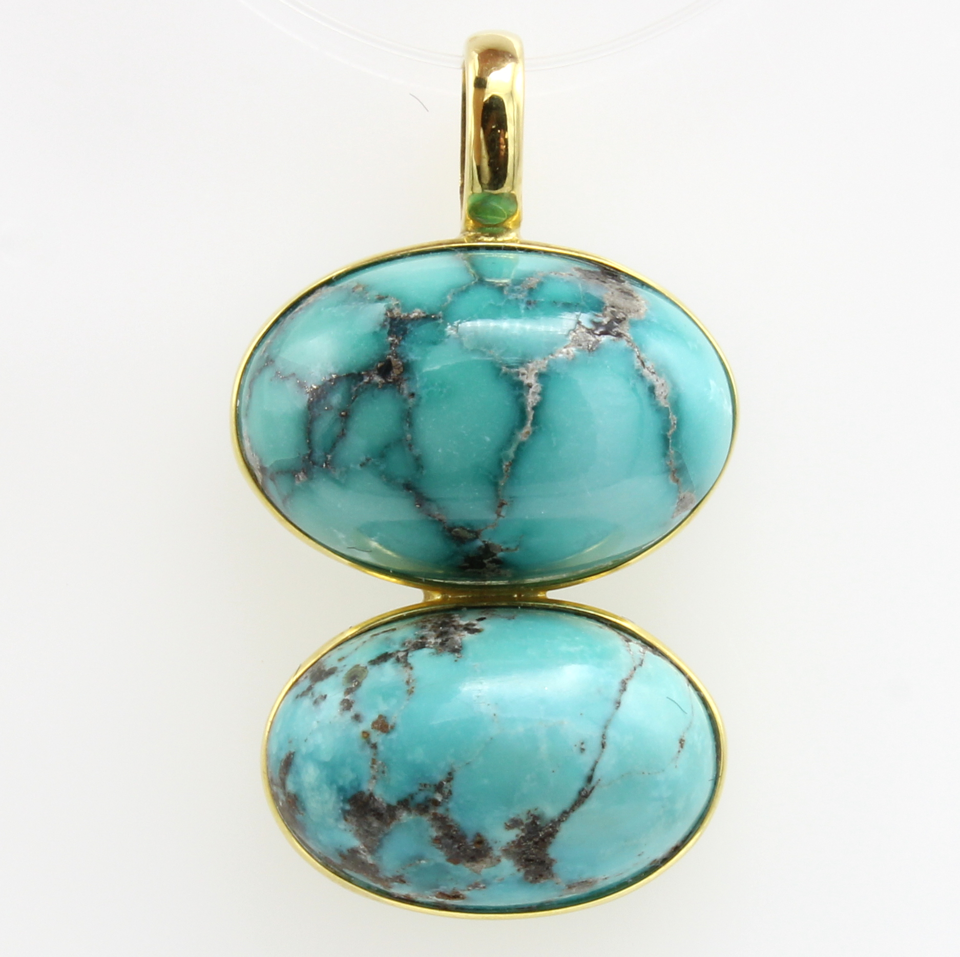 Anhänger mit Türkisen, GG 585/000, 2 ovale Türkiscabochons zus. ca. 19.6 ct Schätzpreis: 1400, - EUR