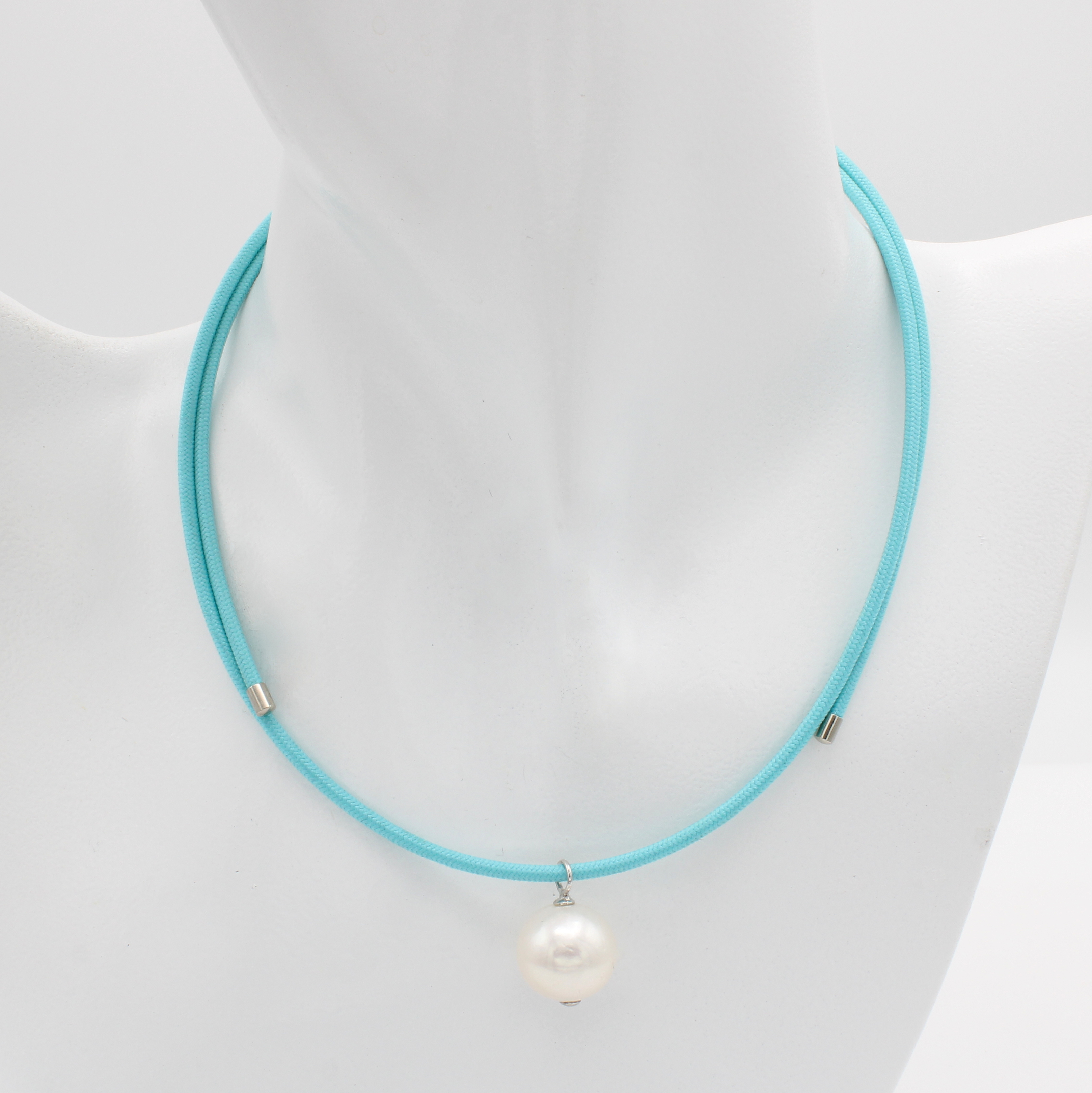 Anhänger mit Süßwasserperle an Magnetband, 925er Silber, türkisfarb. Magnetband, weiße Perle 13 mm, L. variabel, L. ca. 60 cm