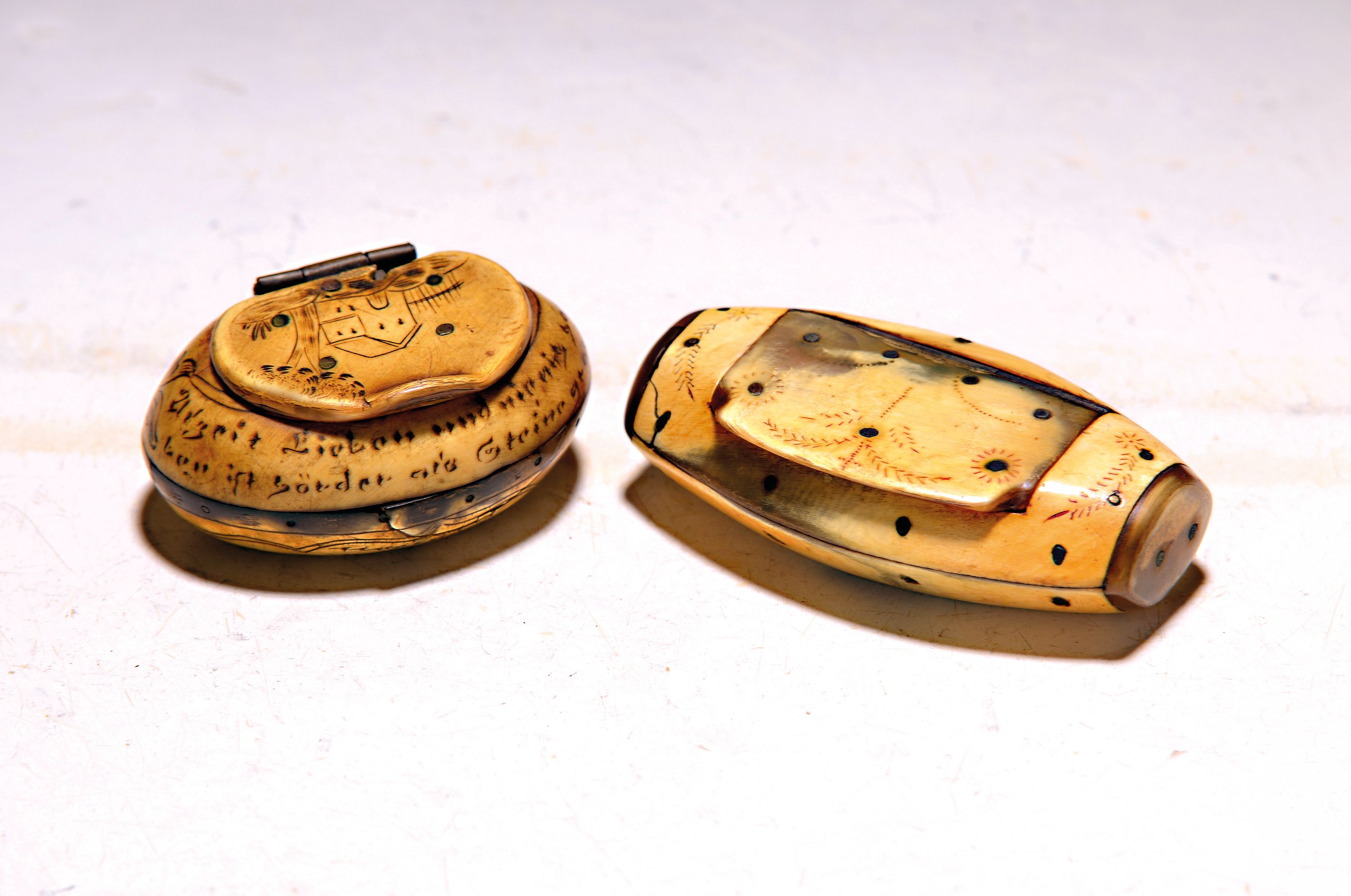 Zwei Schnupftabaksdosen aus Horn, 18./19. Jh., einmal mit Sinnspruch, ca. 3 x 7 x