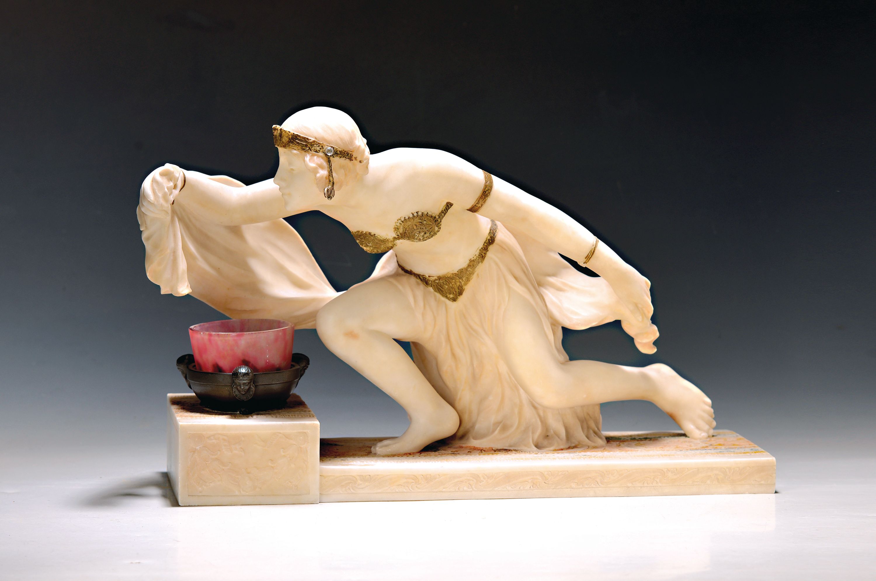Tischleuchte, Frankreich, um 1900, Alabasterfigur auf Marmorsockel, Schirm sign.