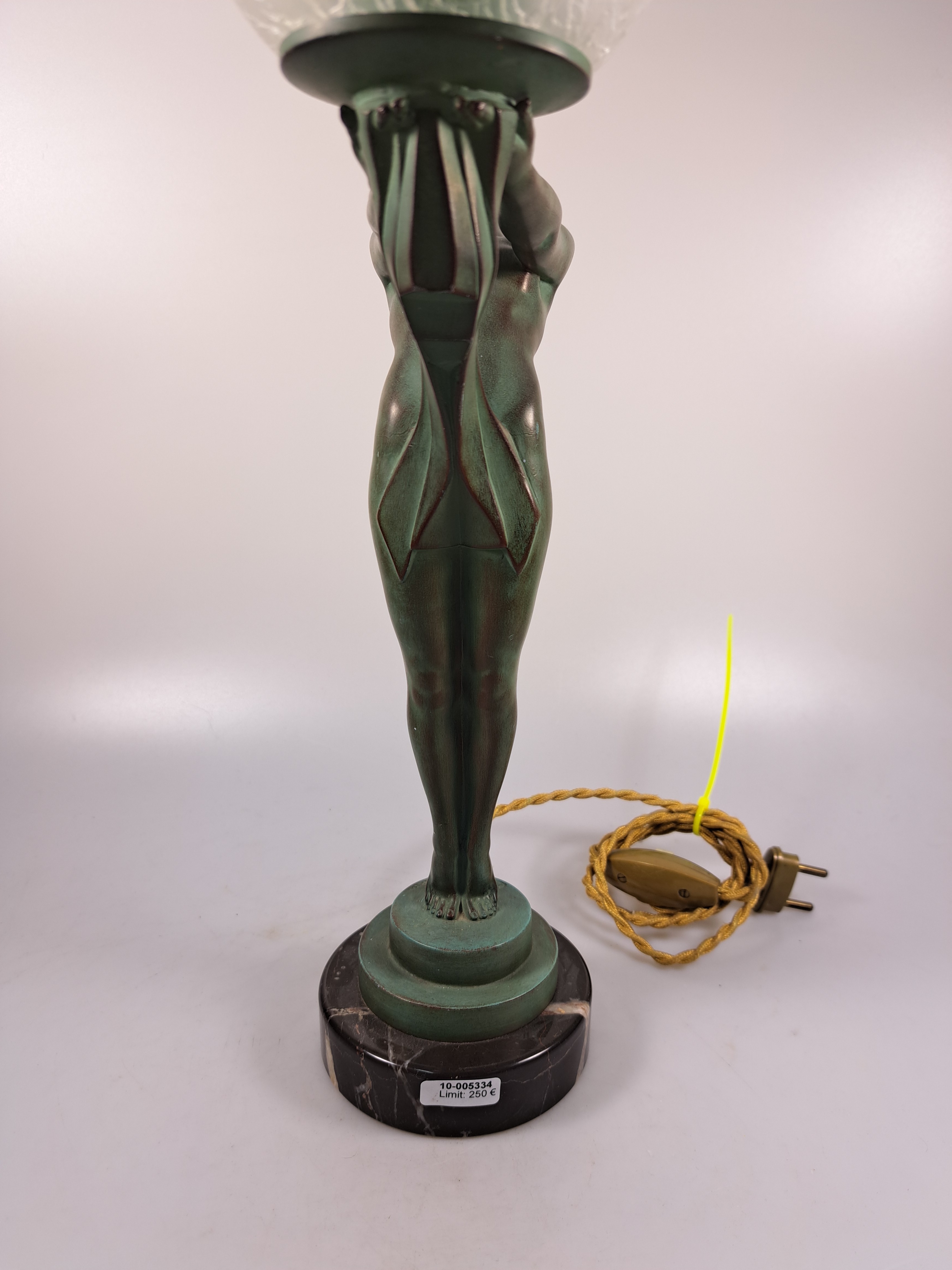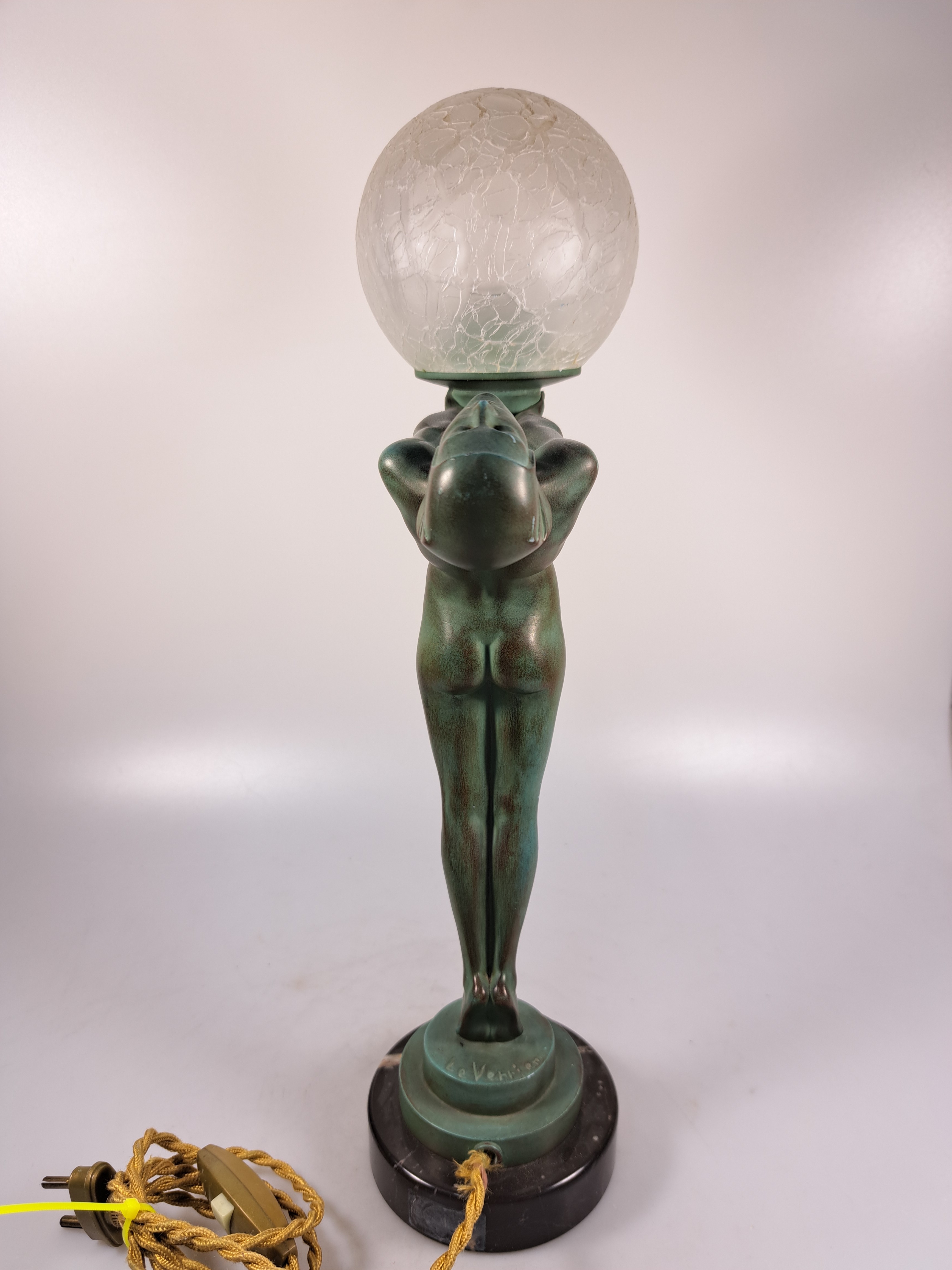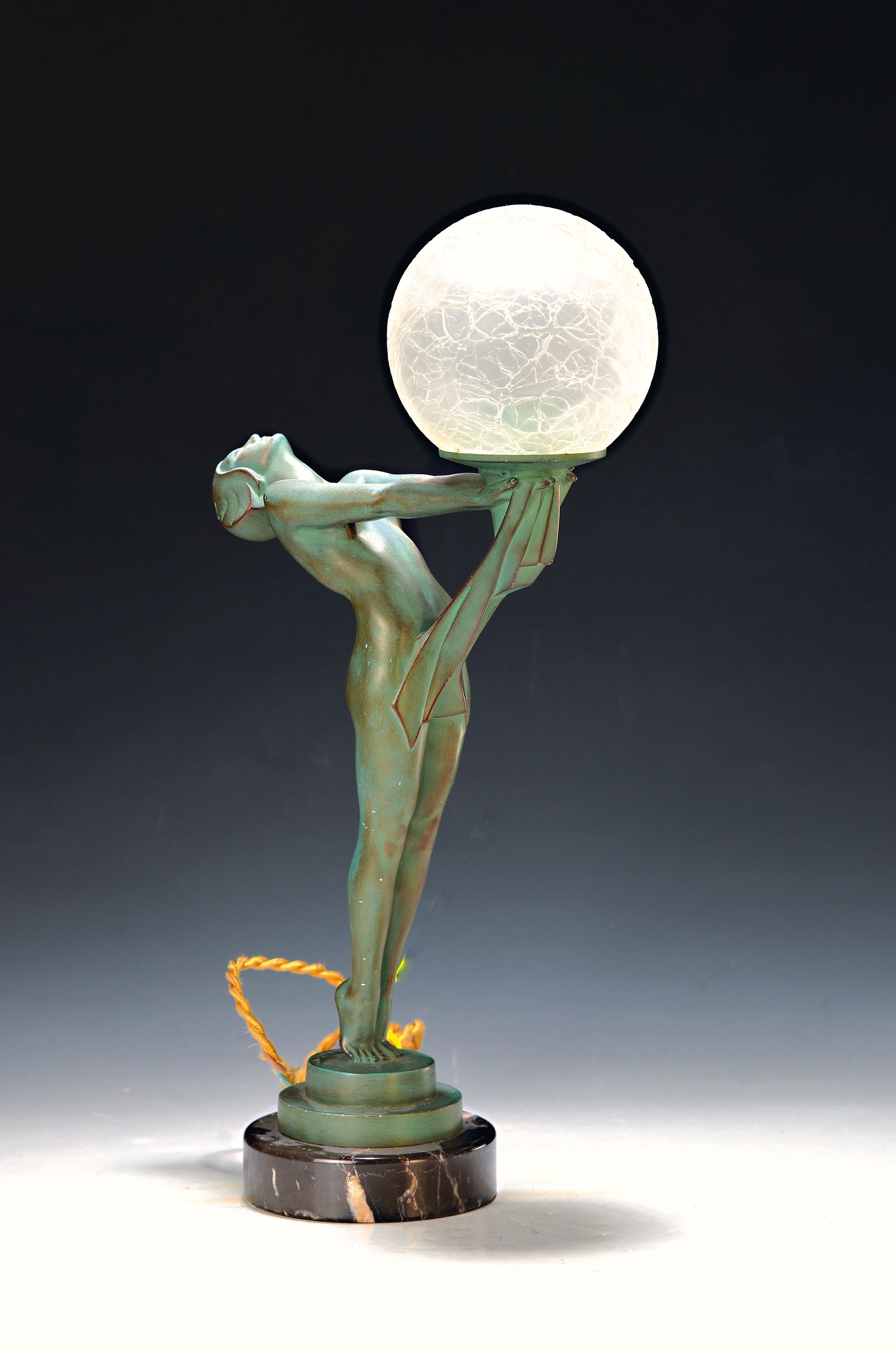 Tischleuchte, sign. Le Verrier, Bronzeskulptur Aktes grün patiniert, Kugelschirm