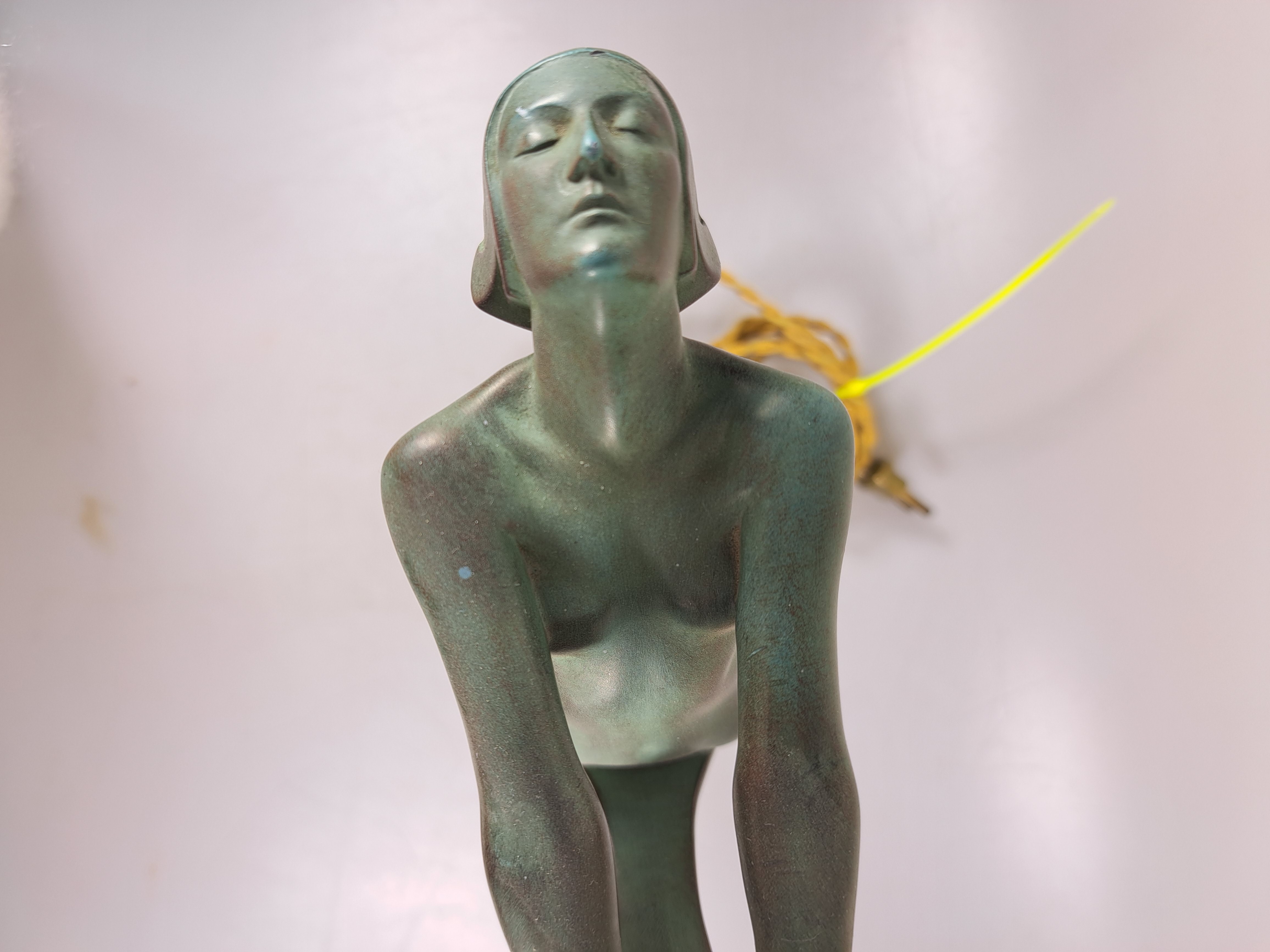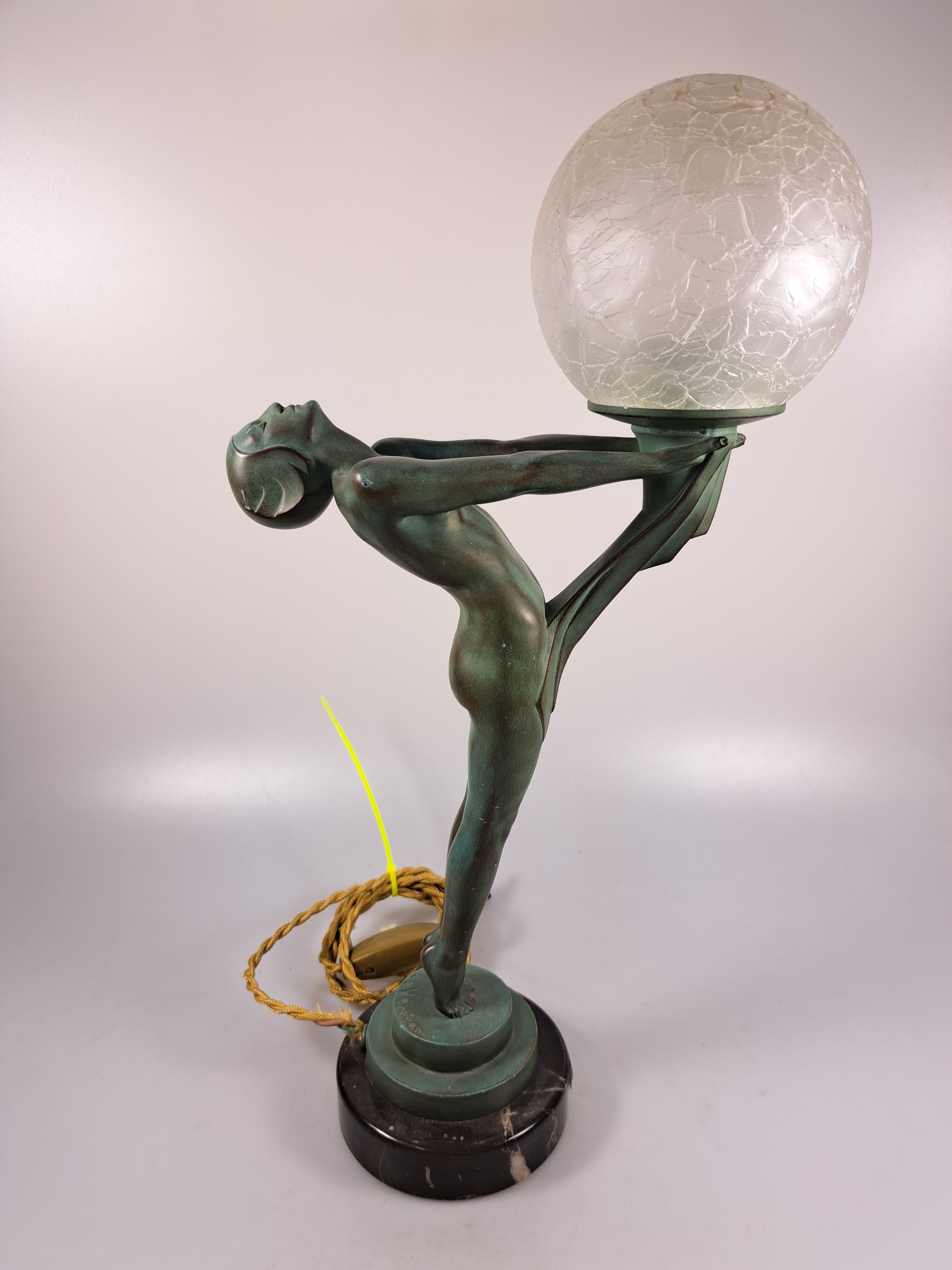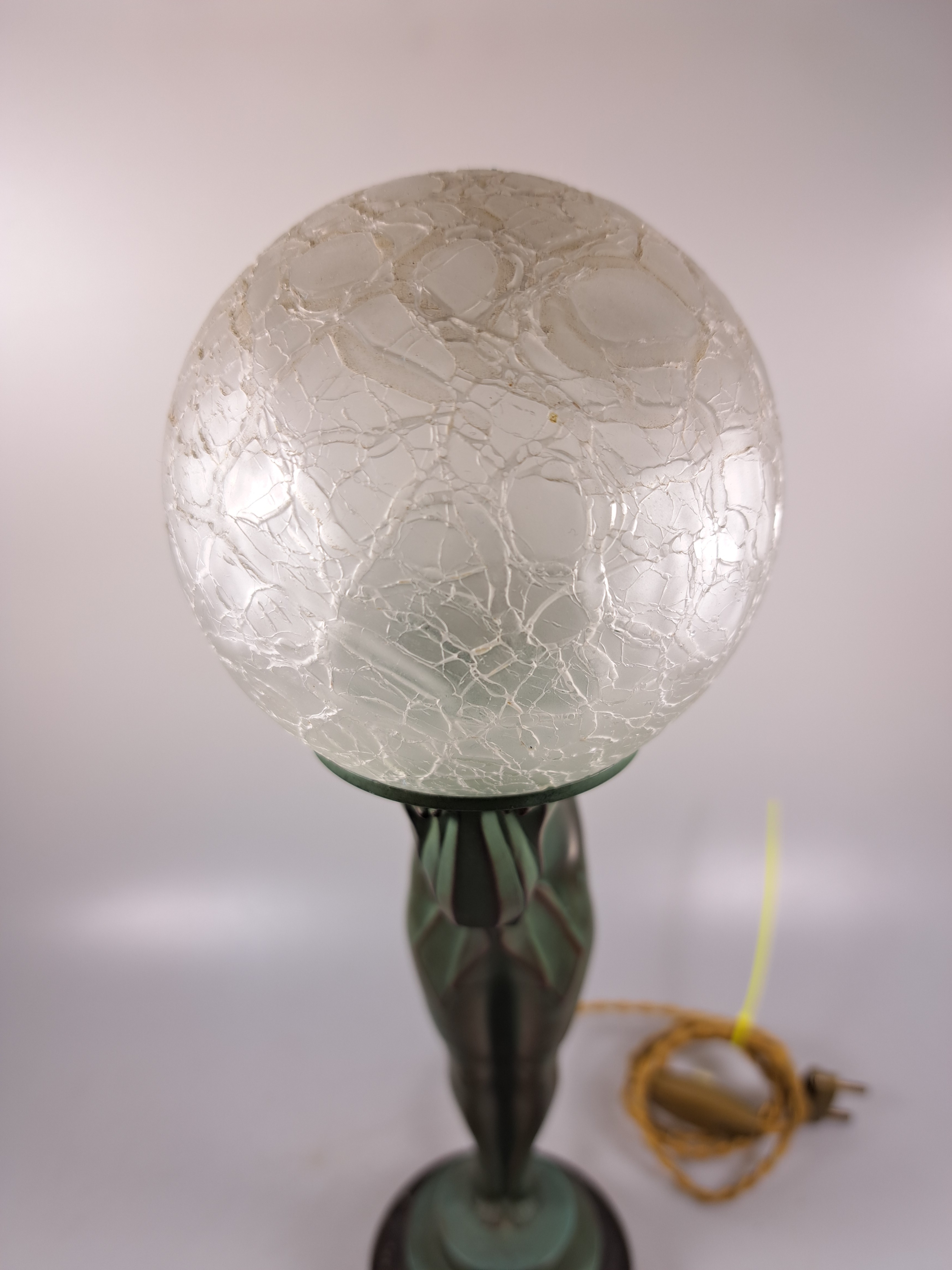 Tischleuchte, sign. Le Verrier, Bronzeskulptur Aktes grün patiniert, Kugelschirm