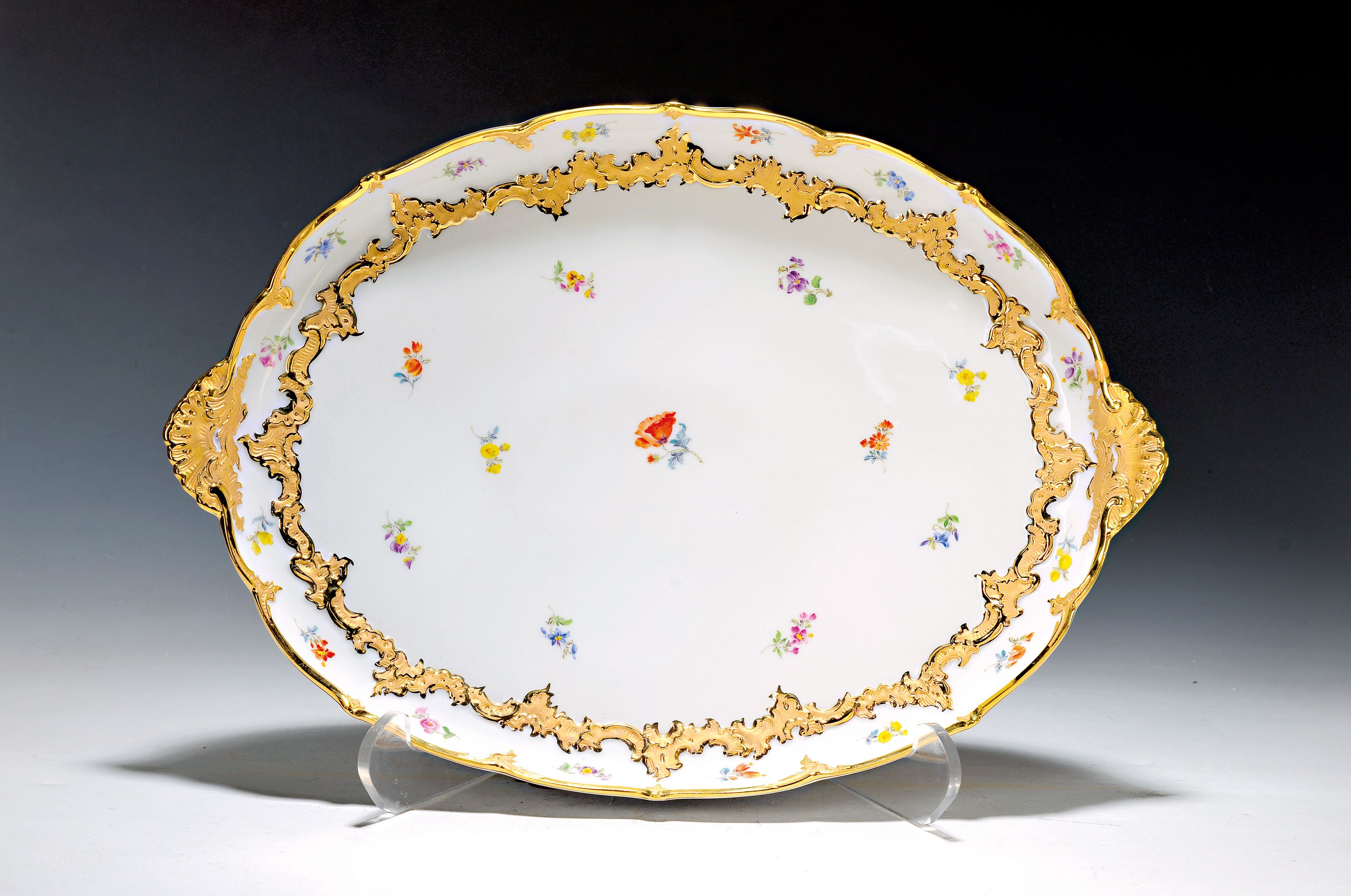 Tablett, Meissen, B-Form, 2. Wahl, Porzellan, gestreute Blümchen, Matt- und Glanzvergoldung,