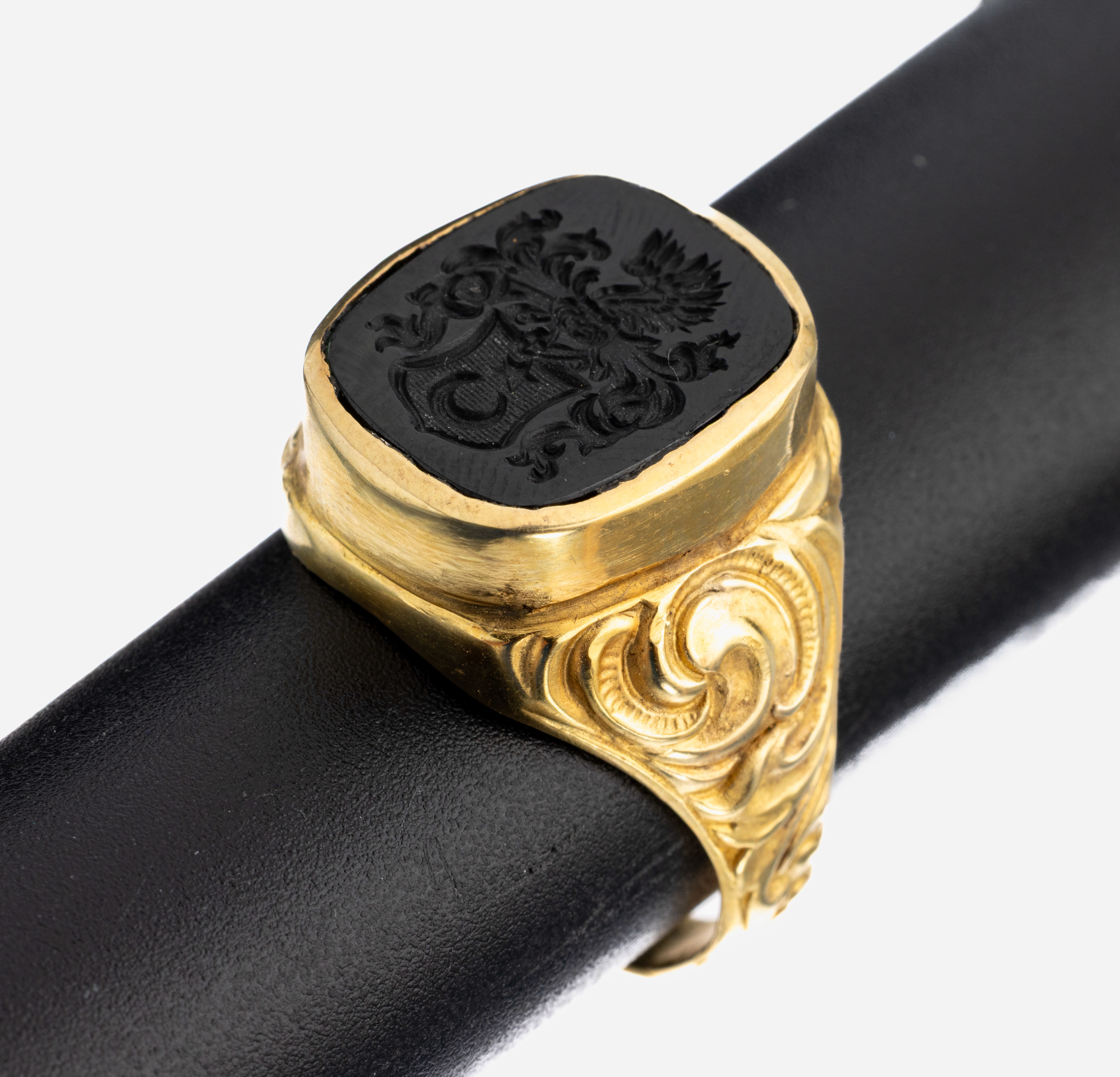 Turmalin-Siegelring, Silber verg., Turmalinmit Intaglio, Darstellung eines Familienwappens,