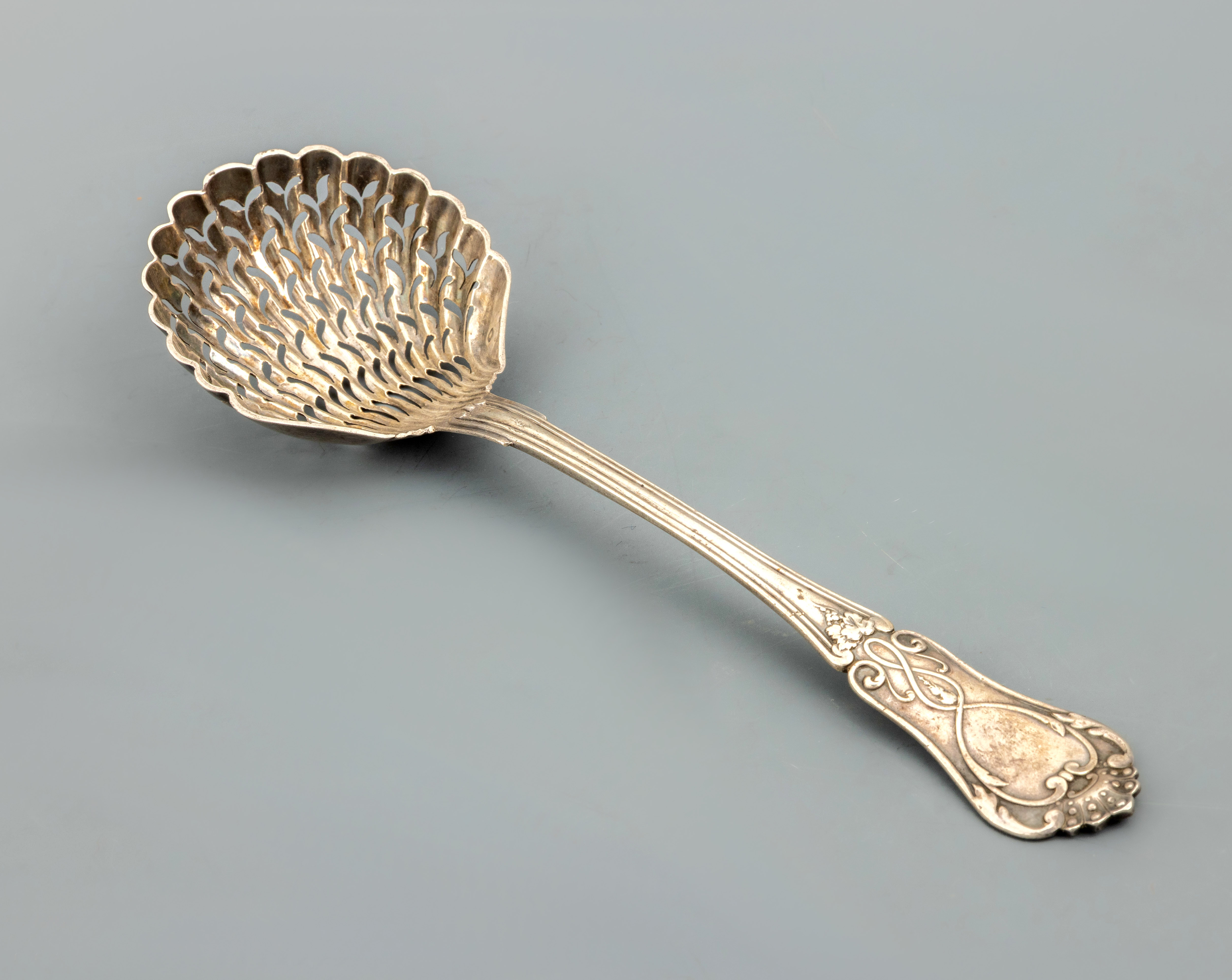 Zuckerstreulöffel, Frankreich um 1900, 950er Silber, abstrakt floraler Dekor, geometrisch