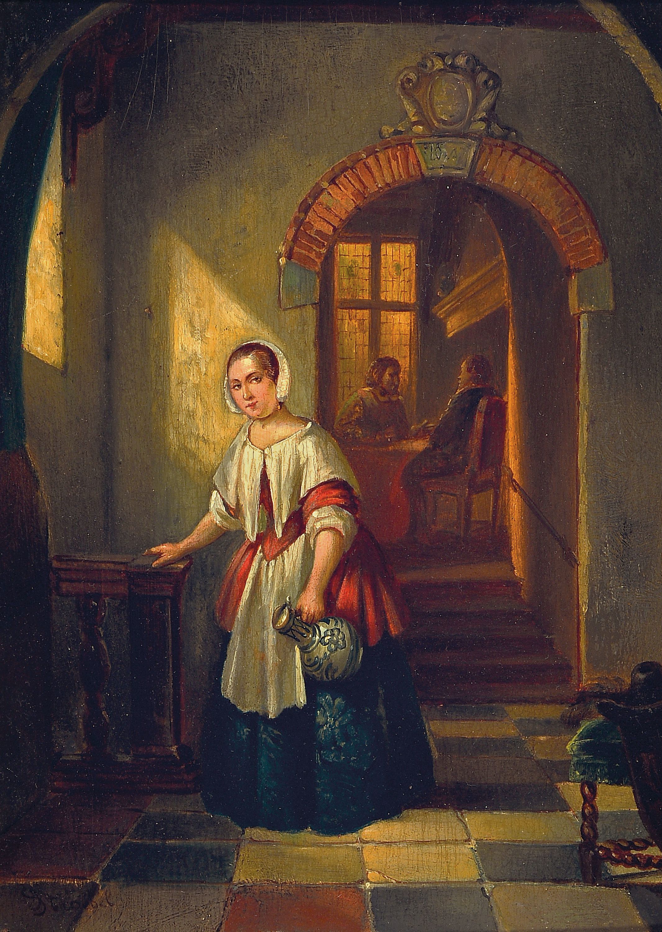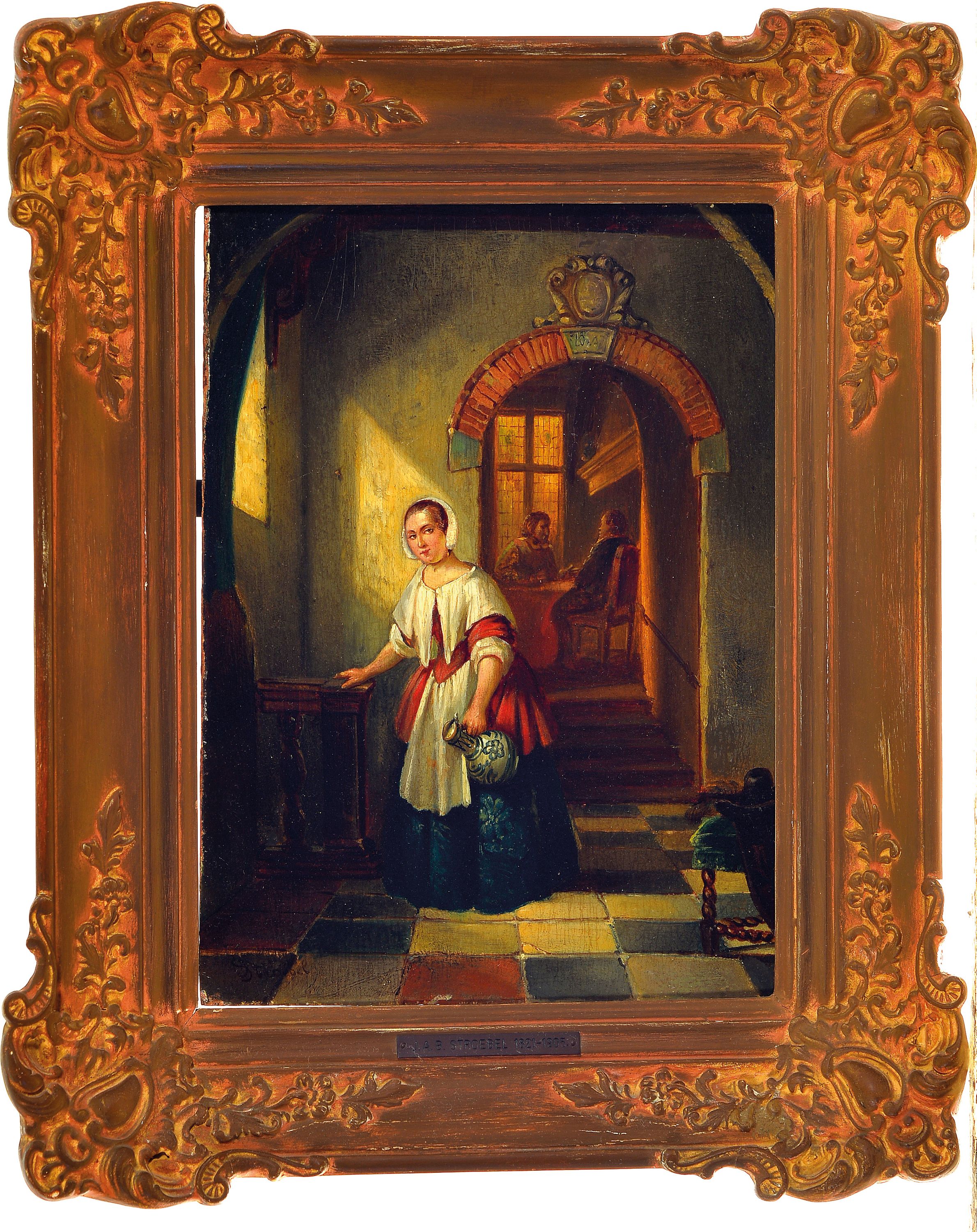 Johannes Anthonie Balthazar Stroebel, 1821-1905, Magd im Hausflur, Öl/Holz, links unten signiert, ca. 27x20cm, R. ca. 37x30cm