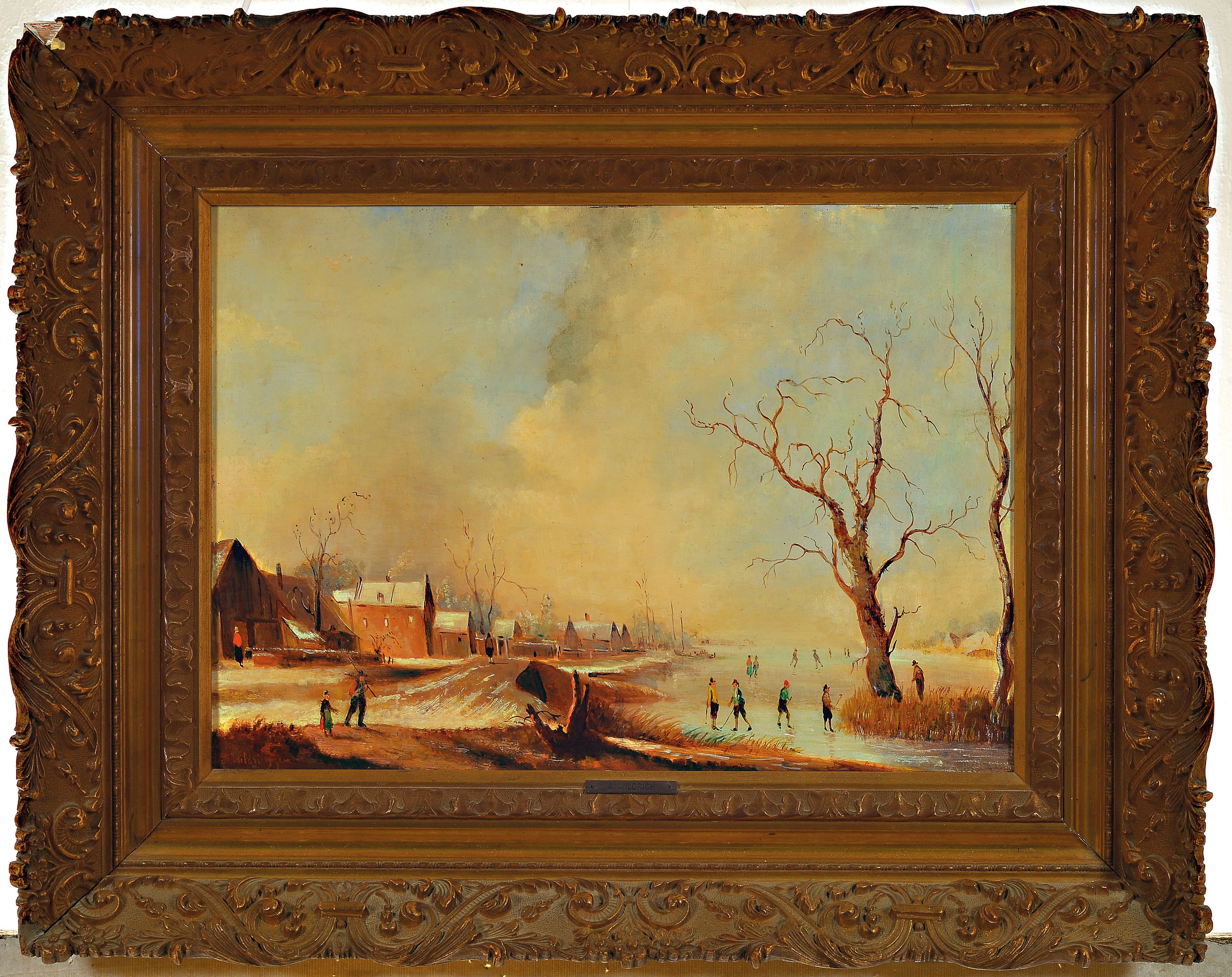 A. Wildrich, Traditionalist im Stil der alten Meister, Eisvergnügen, holländische Winterlandschaft mit Schlittschuhläufern, Öl/Holz, links unten sign., ca. 28.5x39cm, R. ca. 43x53cm