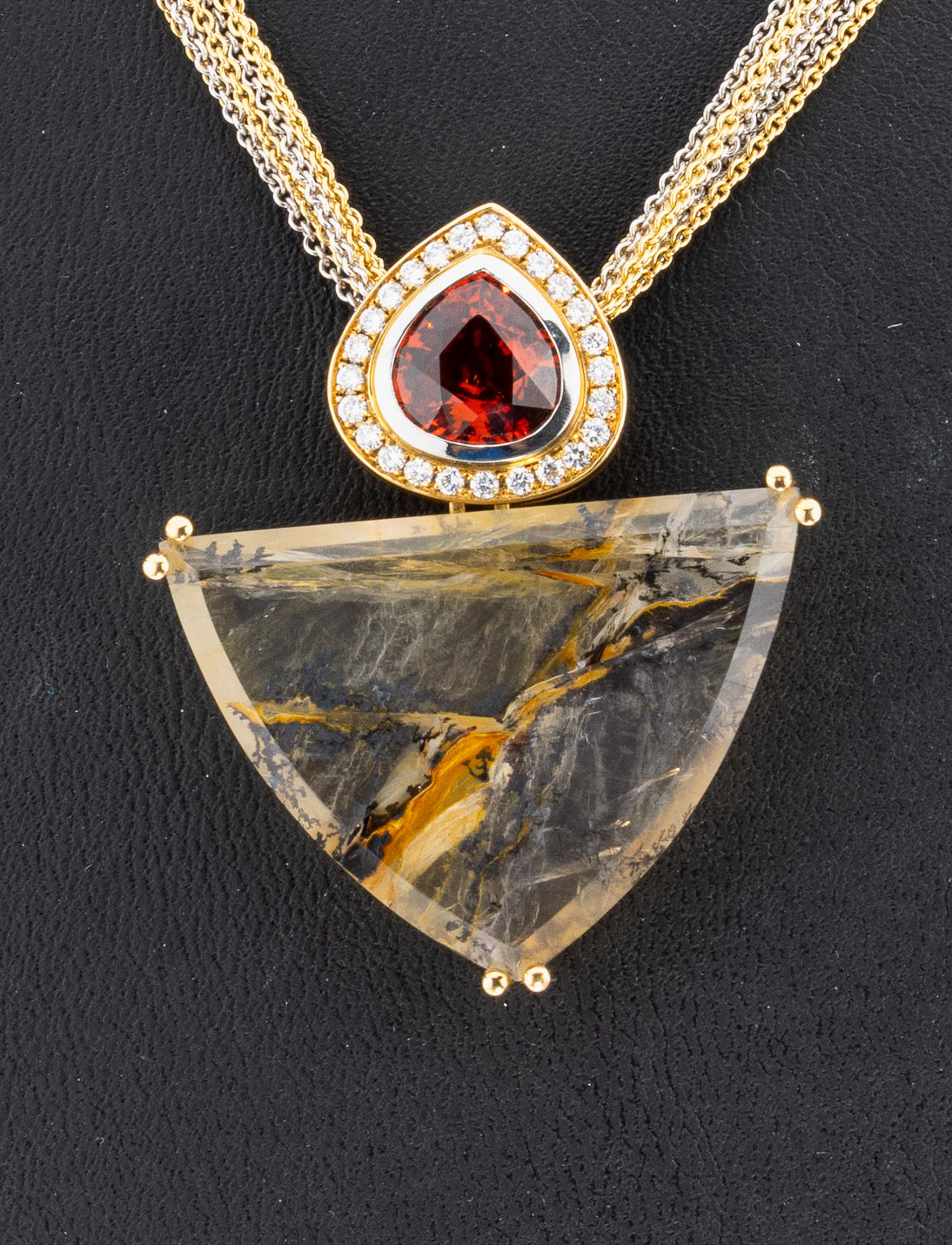 18 kt Gold und Platin Achat-Granat-Brillant- Anhänger, GG 750/000 und Pt, Einzelanfertigung